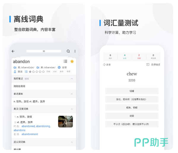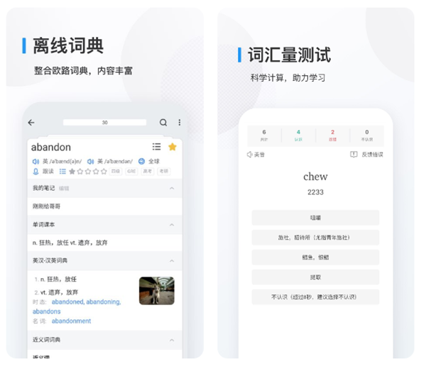 近年来大热的一款英语学习工具,通过不间断的单词测试反映出我们真实的英文水平,并且通过配套的多种训练模式加深记忆。软件还支持一些单词跟读的离线缓存,可以让我们利用碎片化时间来进行单词练习。自动统计生词本和错词本,还支持一键导出打印,稳步提升我们的词汇量,从而提升英语成绩。