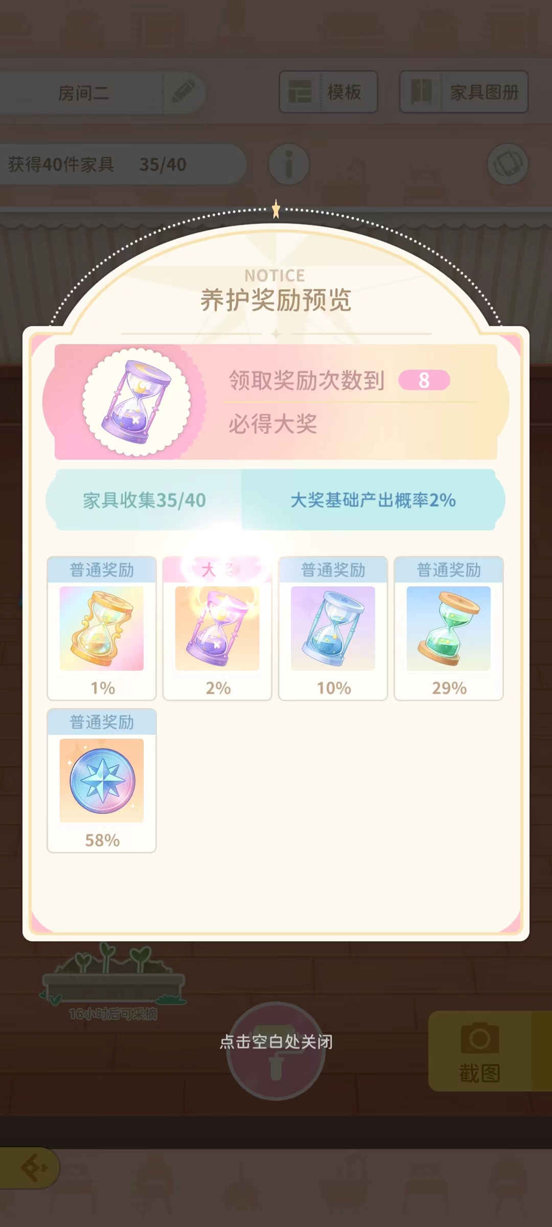 在娃娃屋还会有个可以浇水的植物,我们可以邀请好友帮助我们浇水,如果有越多人帮我们浇水,到养护时间结束后,能领高品质的奖励就越高。
