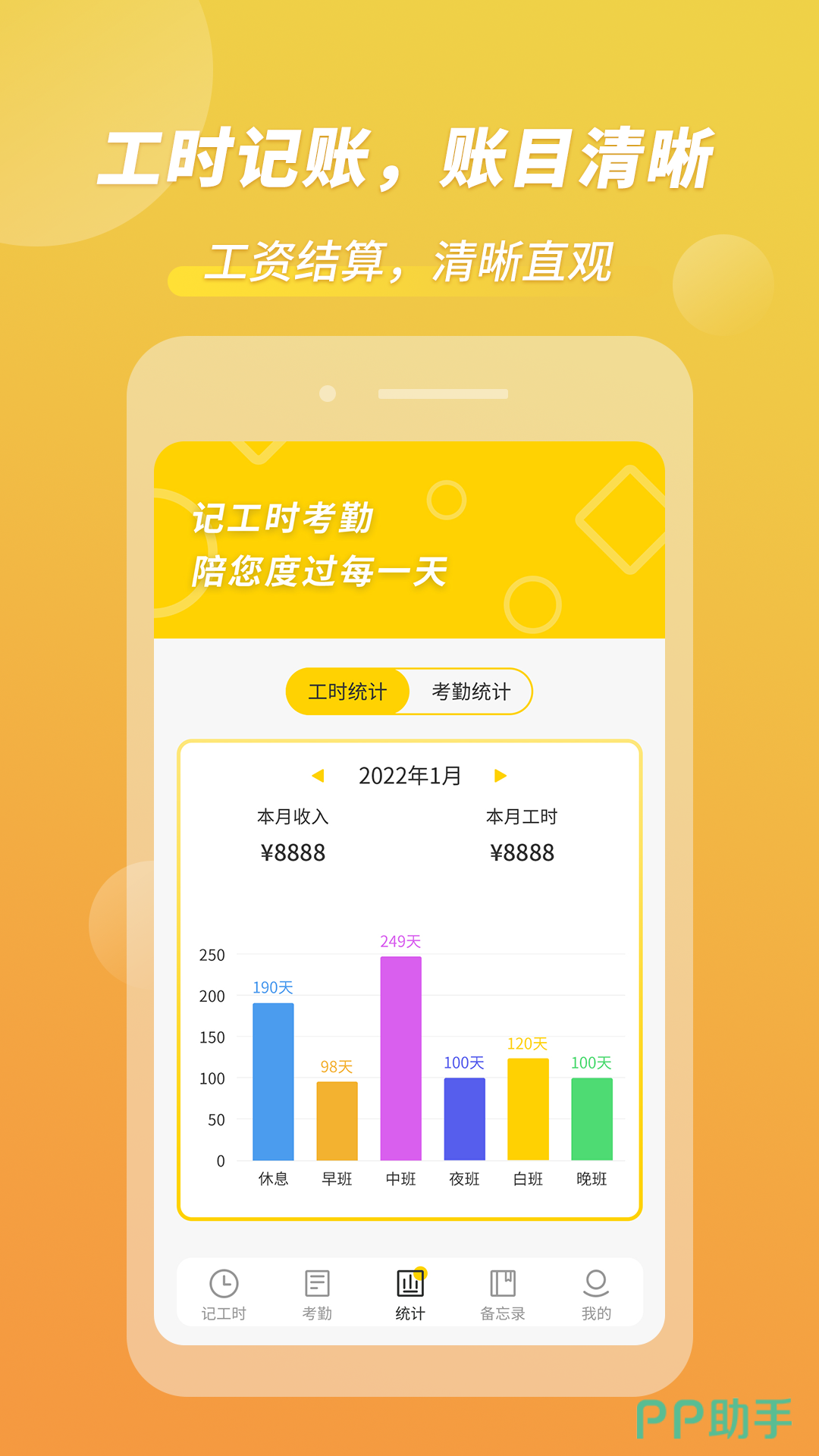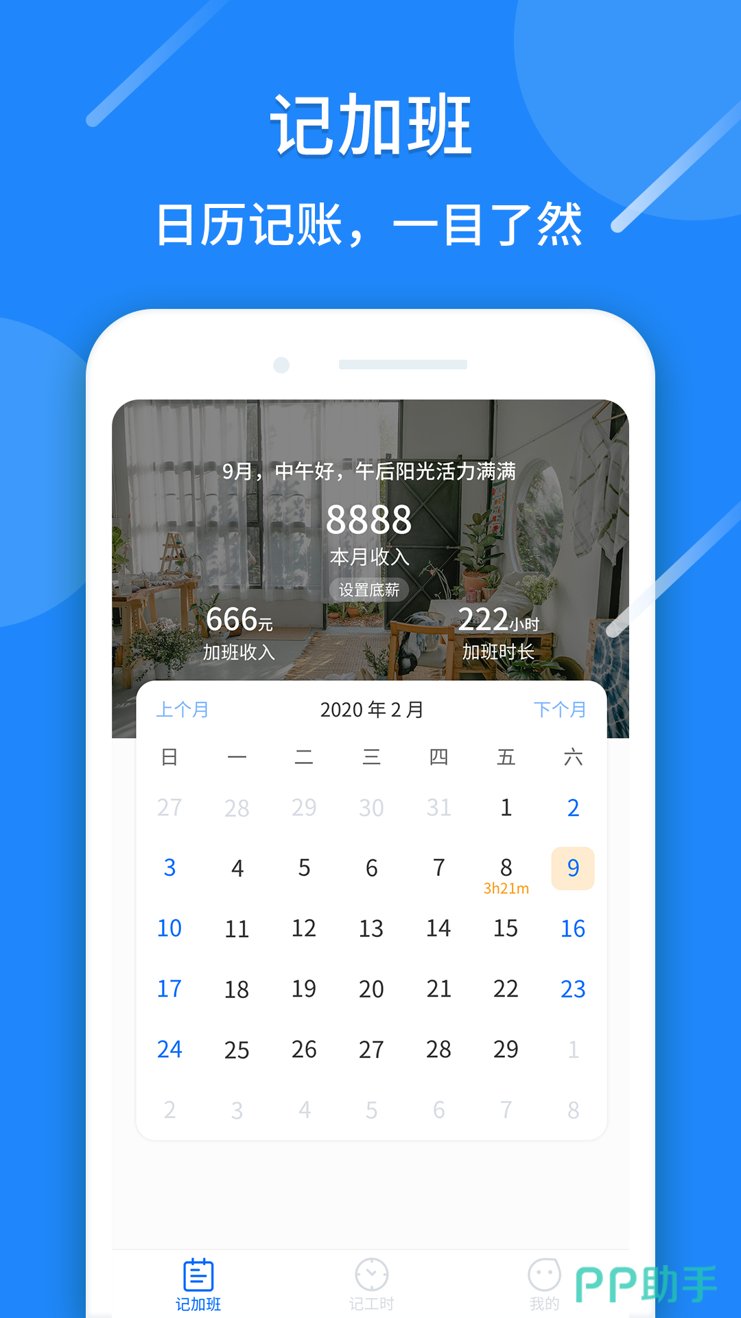 记工时考勤是一款综合了记工资、记考勤记录的加班考勤软件。对于打工族来说,再也不用心记不清加班儿考勤工资了。可以在这里提前设置好底薪工资,通过每天的日历记录自己的加班儿考勤就可以自动计算每天以及统计每个月的工资。到了月末发工资的时候可以轻松计算一个月的基础工资和加班工资。