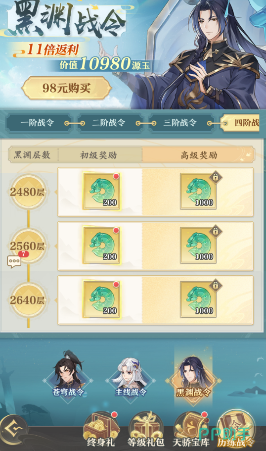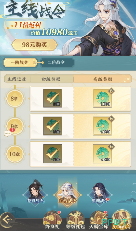 第二种则是98的主线战令,它的返利是十一倍,相比苍穹战令需要靠消耗体力来提升战令等级的方式,它却只需要推进主线章节即可提升等级,不过其中给的奖励都是绿色的源晶,这个源晶在游戏内是低源玉一等的,所以大家如果不是特别缺源晶,可以不用考虑它。