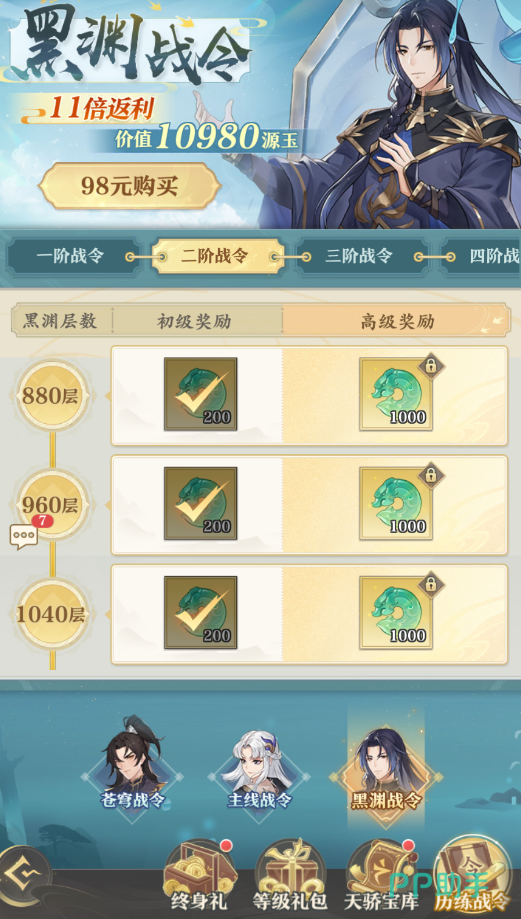 最后就是黑渊战令,这个战令也是名副其实,只要你推进黑渊层数就能提升它的等级,里面提供的奖励同样也是源晶,不过打黑渊本身就有不错的收益,所以已经解锁深渊并有自信推进下去的朋友完全可以冲一波这个黑渊战令。
