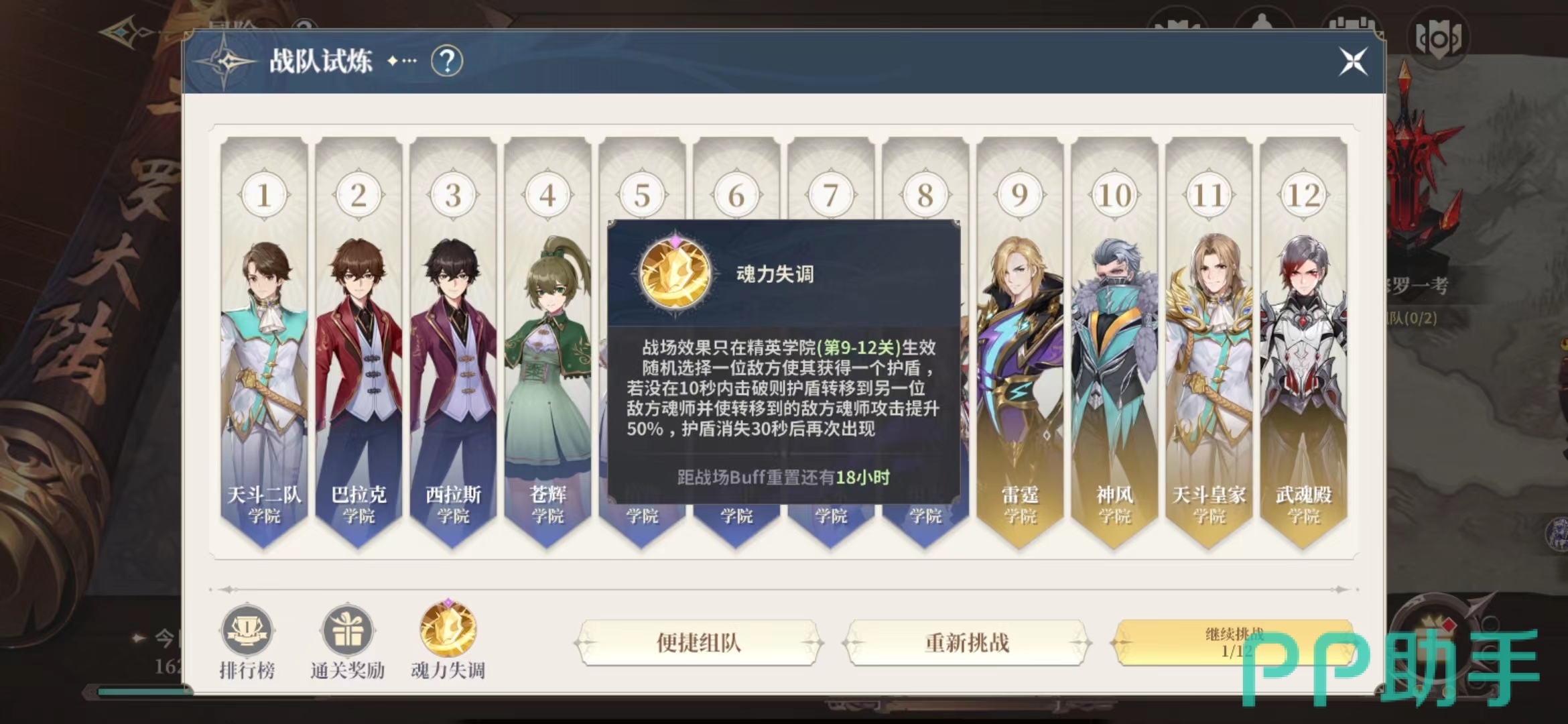 通关时间最后会组成一个排行榜,目前是一共有12个学院可以挑战,在将12个学院都挑战成功之后大家就可以去接取任务的NPC那里,跟他交互之后点击继续挑战,这个时候进度就会重新重置在第9关,每一次参与战队试炼其实大家也可以看见页面下面的一个buff,有这个buff大家通关的效率会更高。