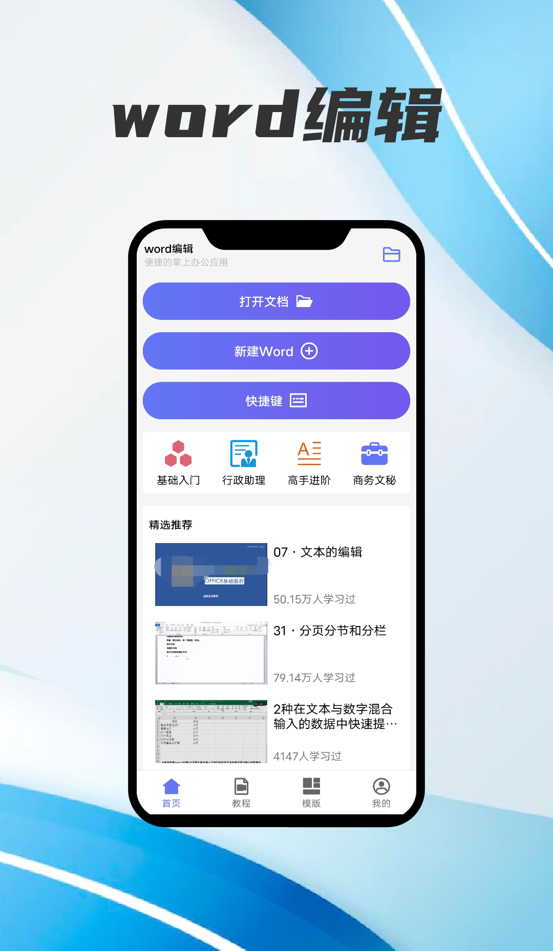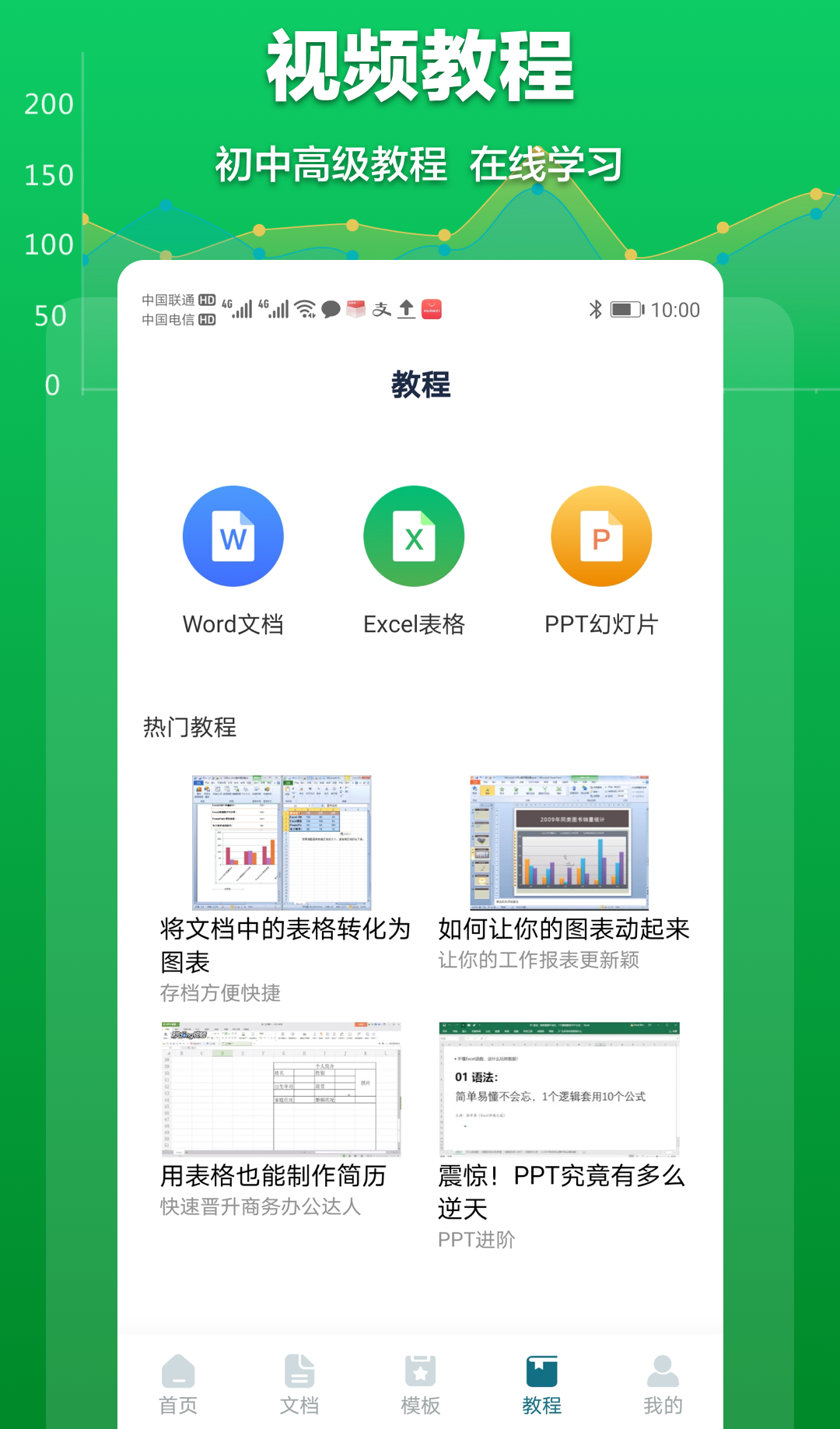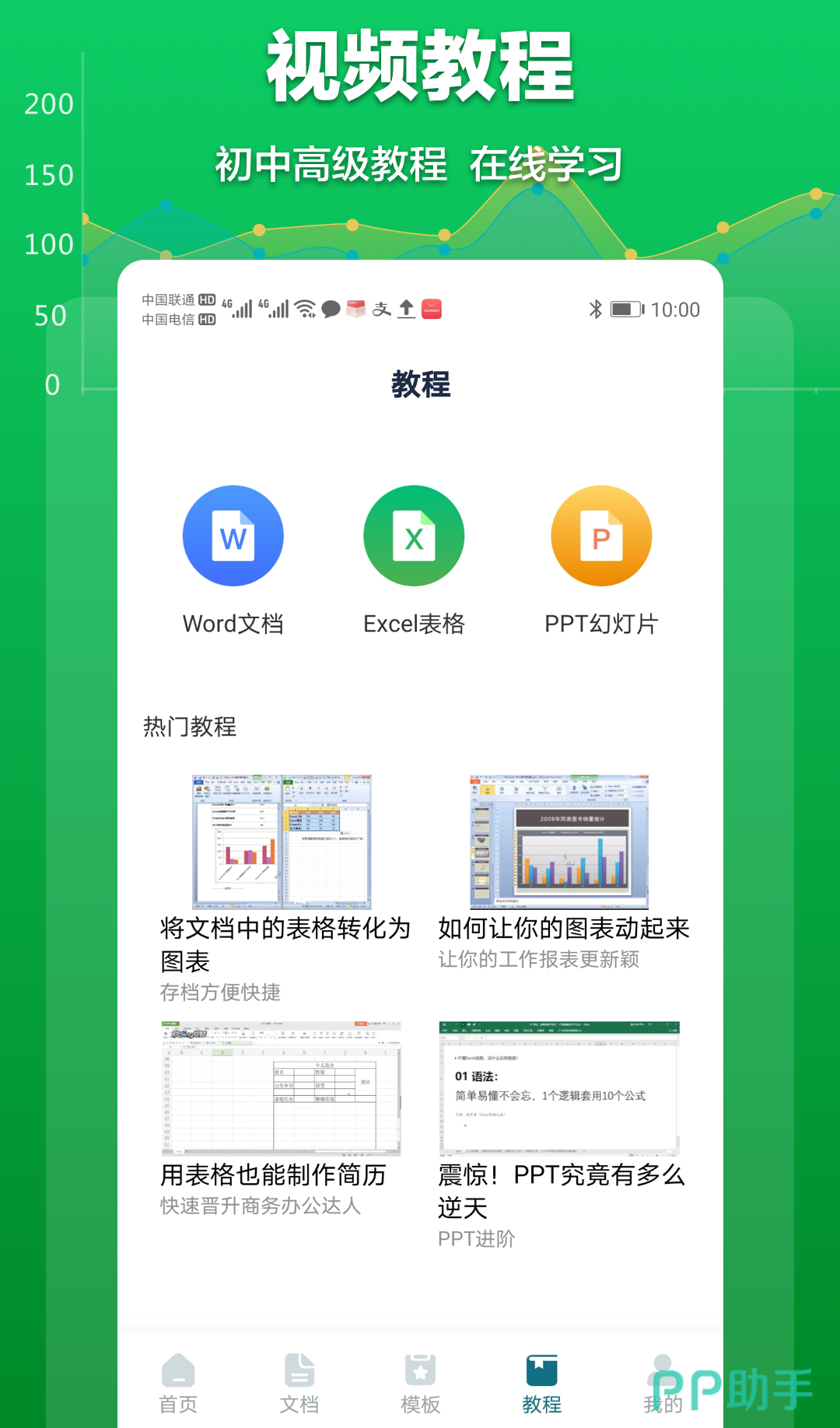 文档办公互助软件,可以满足大家在线。编辑Word文档,也可以根据软件当中的视频来学习对Word文档的编辑与制作,非常多的图表模板和简历模板你都可以直接套用,让大家不断的提升制作技能与工作效率。