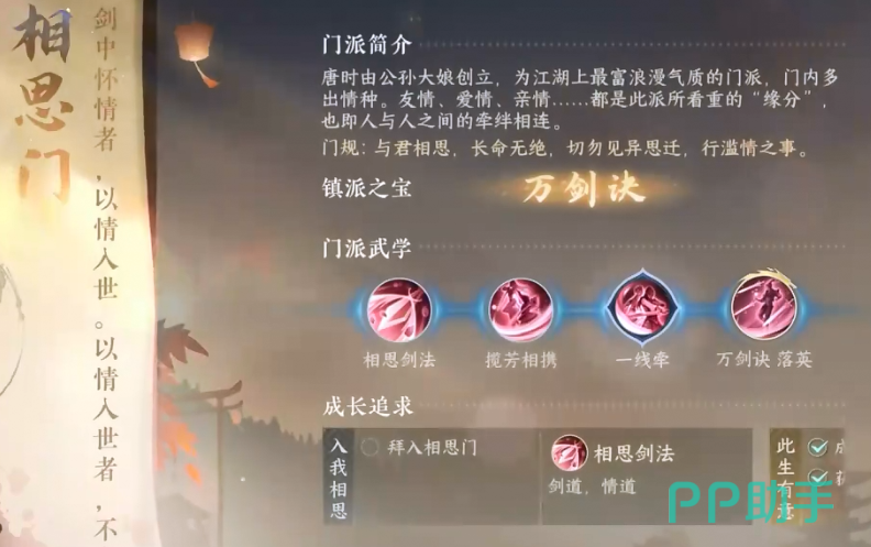在游戏中每个门派都有各自的特色,门派的位置也不一样,受人欢迎的门派有平天门、相思门、无根门等, 想成功加入门派,也需要完成一些任务。有些玩家对门派不了解,随便选择一个门派加入,其实这并不是什么大问题,以后也可以退出加入别的门派。