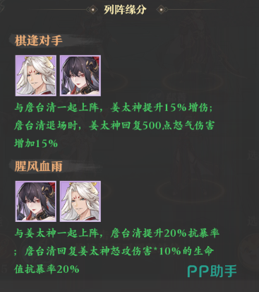 并且这套阵容也是不缺辅助的,伊秋水和詹台清都能通过技能和被动为队友提供治疗,其中詹台清还可以与姜太神组成羁绊,以此获得额外抗暴率和回复效果。