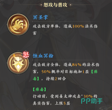 值得一提的是姜太神本身的作用在阵容中也十分明显,不仅能对全体敌人造成法术伤害,还能凭借与詹台清的“棋逢对手”羁绊来打出更高的爆发,而且如果把詹台清放在前置位进行牺牲,这个爆发伤害还能进一步提升,而且羁绊效果所提供的的500点怒气回复还能让姜太神的爆发频率变得更高。
