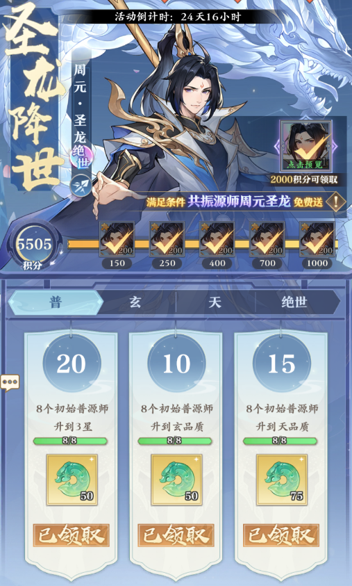 同时在组队的上场的时候,玩家们也只能在共振源师和原生源师两个角色中选择出一个进行组队上场,目前游戏中给玩家们推出了【周元·圣龙】的公振源师的活动,玩家们只要完成一些升级活动,凑齐2000积分就就可以获得周元·圣龙的碎片以及原生1200个碎片来进行强化升级;