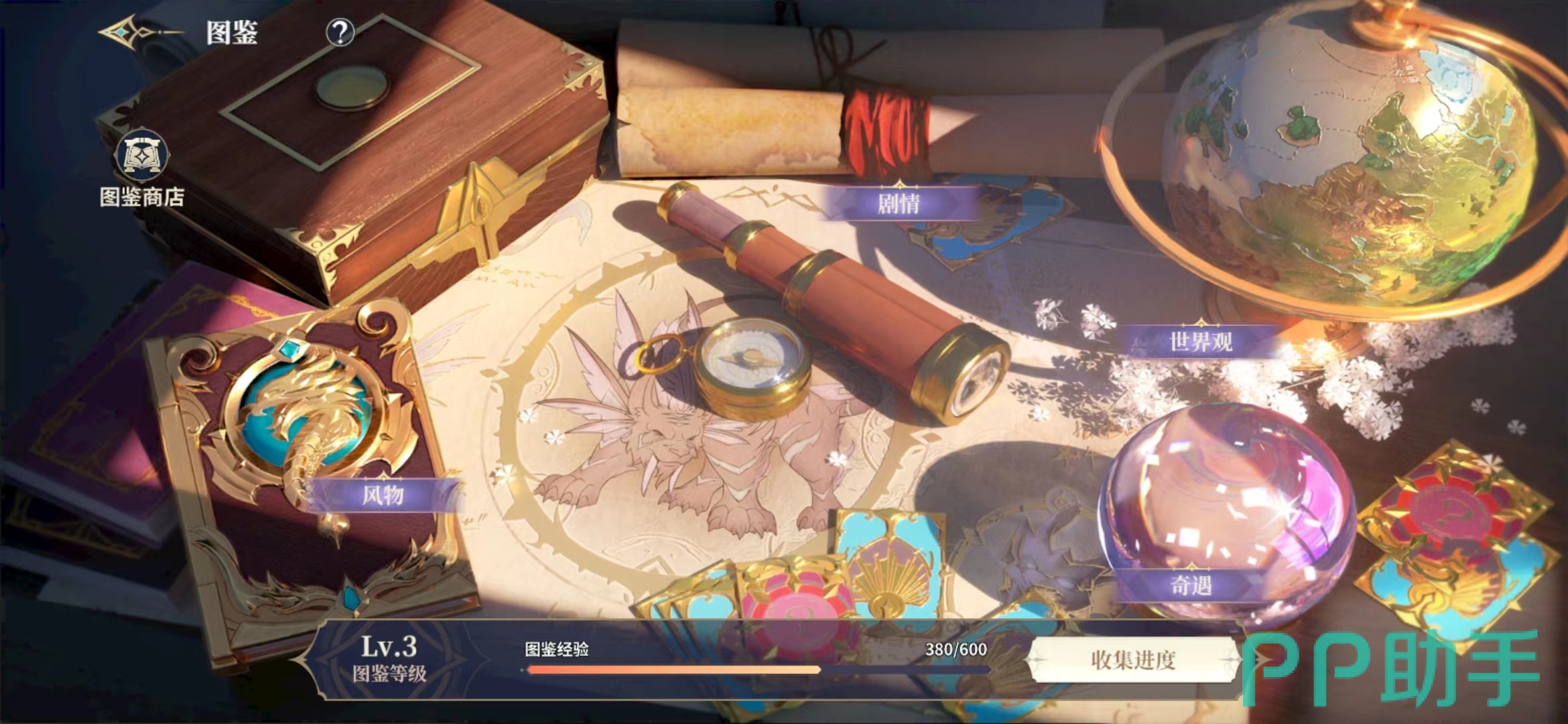 世界观的图鉴其实都是一些指定地图区域的图片,大家可以根据地图上面的显示到达相应位置然后拍照来点亮图鉴,最后还有一个奇遇的土家,奇遇图鉴当中大家可以去各地触发奇遇,完成之后这个奇遇的图鉴就会被点亮,而点亮了图鉴之后不仅有奖励还有积分,这些积分可以帮助大家提升图鉴等级,然后去图鉴商店中兑换高级资源。