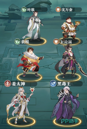 这套阵容的方案是“叶歌+沈万金+袁鲲+卫沧澜+姜太神+黑毒王”,这套阵容的保护能力十分突出,可以让黑毒王更加肆无忌惮的进行输出,其中叶歌提供全体抗暴加成,袁鲲提供护盾,而沈万金则能通过怒攻来减少前排敌人的伤害以此间接保护队友。