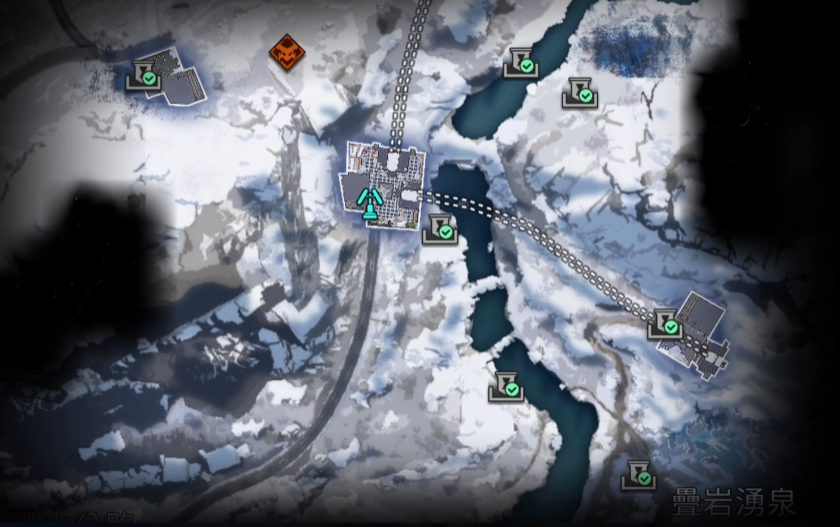 接着继续往左前方前进就能看到涌泉,涌泉的左前方楼房附近有一个探索点,再往前行进的地方有一条河,河道的两边都有溢出探索点,另外涌泉的正下面方向是一个林场,林场有四个探索点,其中两个是需要玩家行过高速桥梁才可以看见的,继续前行就会看到一处浅雪地,浅雪地的周边有三个探索点,大家仔细找找就会很容易发现,另外在前往小镇的路上也有两个探索点。