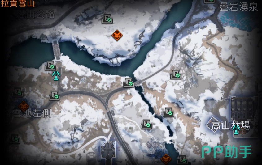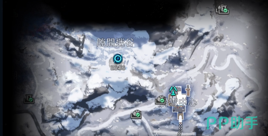 所以物资的分布点就很重要,每一个地图都会有各种可探索的区域,大多数的玩家会通过接收委托任务来进行探索,因为这样可以一举两得,其中在拉贡雪山地图里雪山可探索的区域是最大的,进入雪山后的位置是在入口处的左下方,沿着入口往上走一段时间就可以看滑雪中心,这是第一个出现的物资探索点,在滑雪中心的左侧其实还有两个比较小的探索点,然后沿着左上方行进,这里是迷谷,此处的左手边有一个探索点。