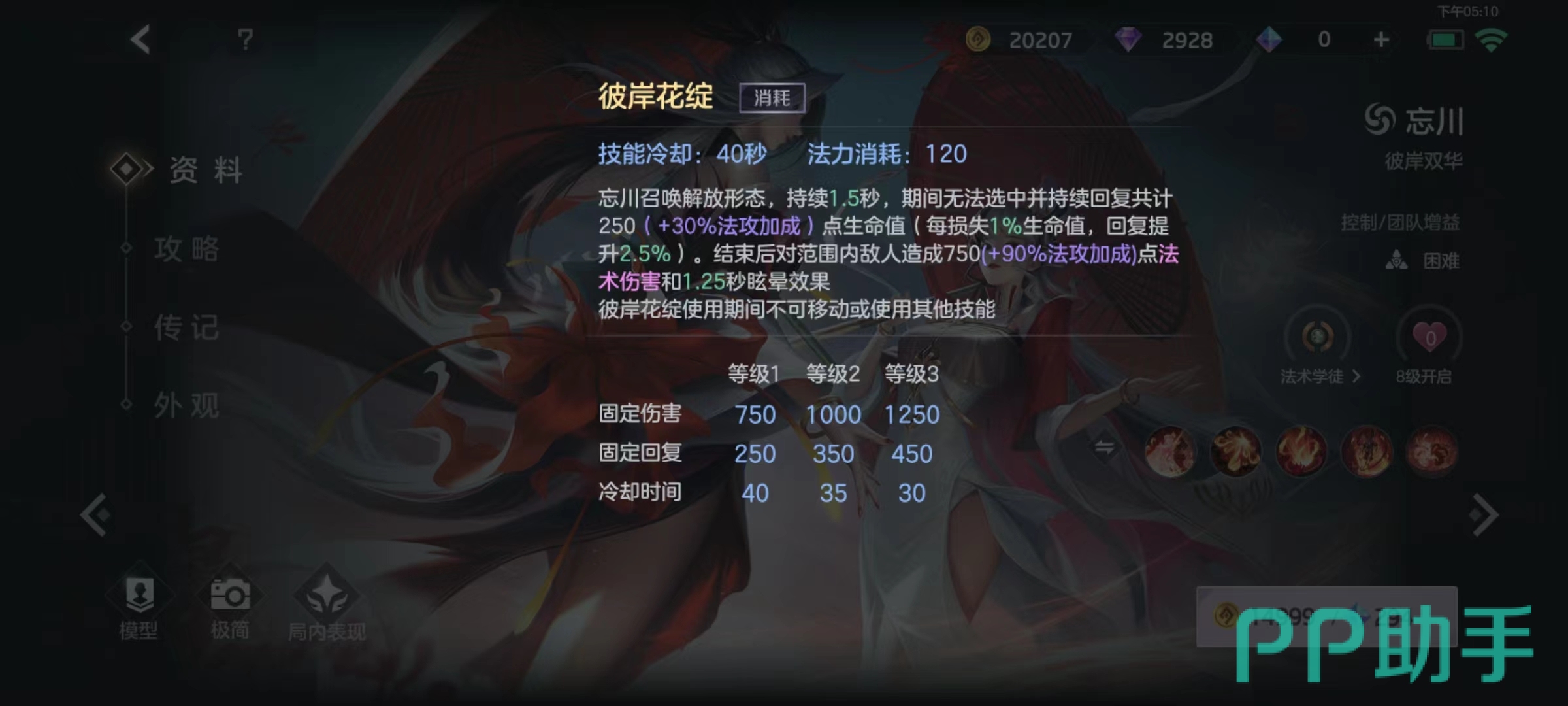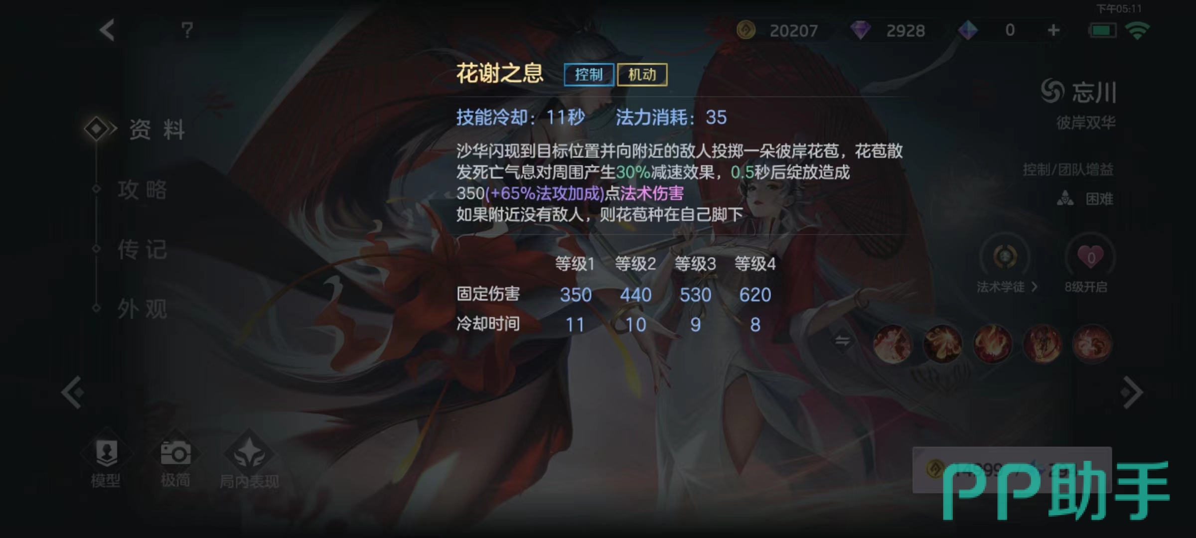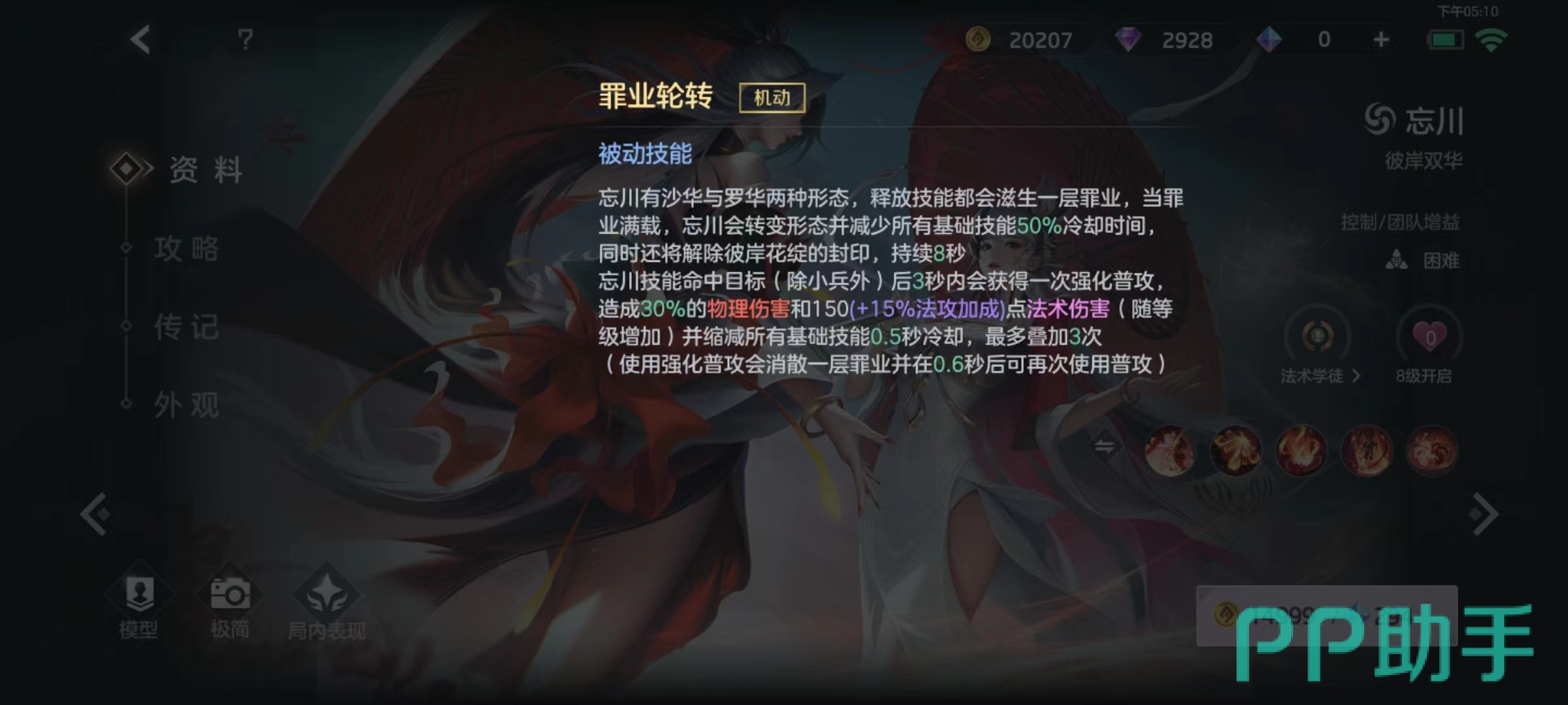 该角色拥有两种不同形态,每次释放技能都会叠加一层状态,当状态叠满之后,就会转变形态,并且降低所有技能冷却时间,还会将彼岸花绽封印解除。此外技能命中除小兵以外目标时将会获得普攻强化,打出去之后还会缩减基础技能冷却时间。这里要注意的是,强化之后普攻不一定要立即打出去,因为最佳可以叠加到三次,只要有足够罪业层数,就可以在很短时间内再次使用普攻。