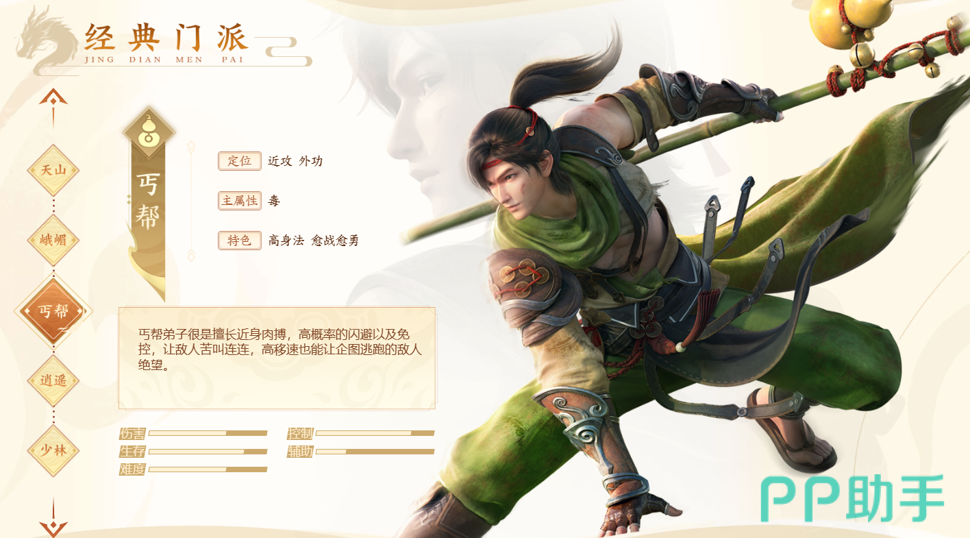 除此之外,丐帮也是一个不错的选择,丐帮是一个以近战和控制为主的门派,它的技能可以使敌人陷入各种不利状态,例如眩晕、减速、沉默等,同时也有一些增益和回复技能。丐帮的优点是在单人战斗中表现出色,可以轻松地压制敌人,而且对装备的需求也不高。丐帮的缺点是在团队战斗中需要注意自身安全,避免被敌方集火或者被控制。丐帮的玩法是利用技能间的连招和切换来打出高伤害和高控制,例如使用“打狗棒法”来打断敌人的施法,或者使用“降龙十八掌”来造成大范围伤害和眩晕效果。如果你想成为一个灵活的近战者,那么丐帮是一个不错的选择。
