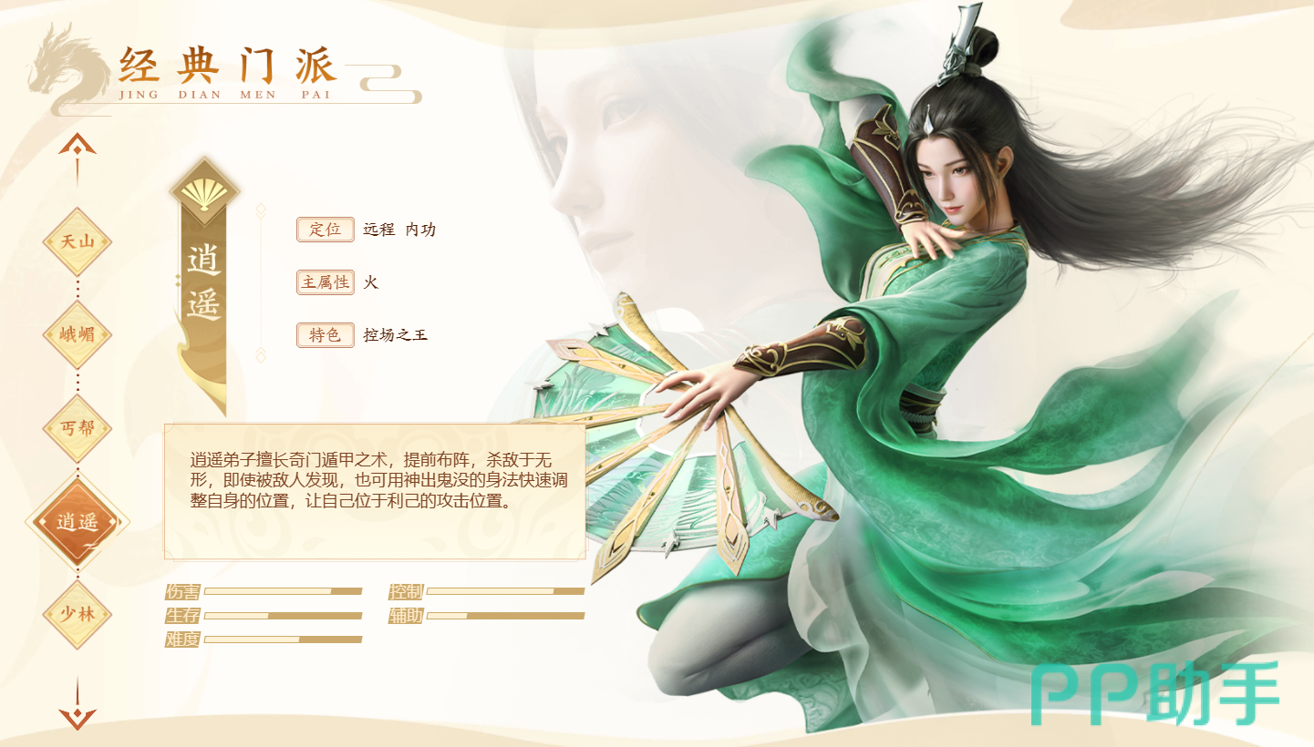 最后大家也可以试试逍遥派,逍遥是一个以远程和变化为主的门派,它的技能可以根据自身状态切换不同的形态和效果,例如火、冰、毒等属性攻击,同时也有一些回复和闪避技能。逍遥的优点是在各种战斗场景中都有不错的表现,非常灵活,而且同样对装备的需求也不高,主打一个多样化。单逍遥的缺点是在操作上需要一定的技巧和判断力,需要注意自身状态和形态切换的时机。逍遥的玩法是利用技能间的变化和搭配来打出多样化和灵活性高的攻击方式,例如使用“三花聚顶”来提升自身属性,或者使用“五气朝元”来切换不同的形态和效果。如果你想成为一个多变的远程者,那么逍遥是一个不错的选择。
