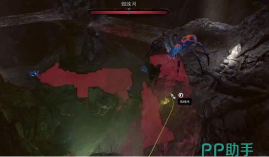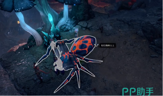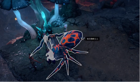 我们前往低语深地,会在路上发现一个巨大的蜘蛛,这就是我们此行的目标:蜘蛛女王。我们可以使用偷袭,潜行到蜘蛛女王的身后将它推到幽暗地域,然后去拿它身上的物品,也可以选择正面战斗,将它杀死,再进行搜刮。