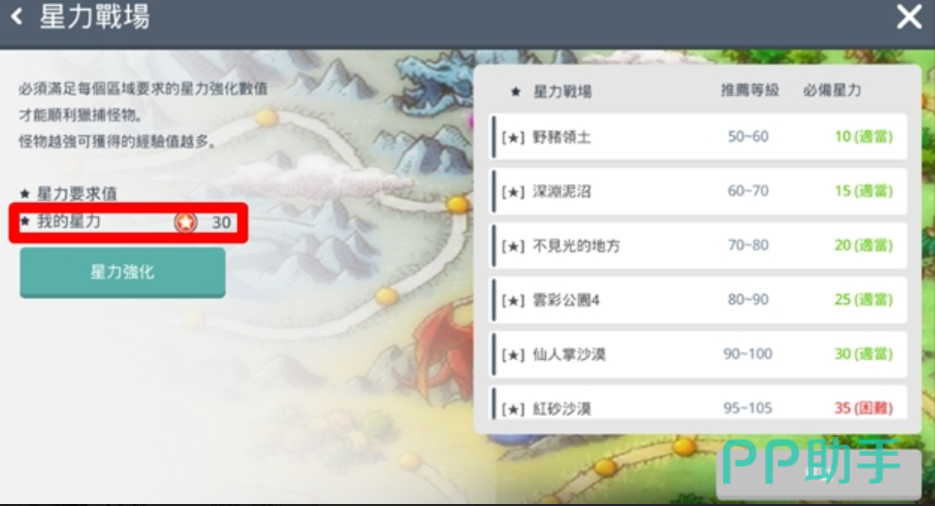 星之力是用于强化装备的数值,不同的装备拥有不同的星之力强化上限。您可以在道具详细资讯中找到装备的星之力信息。需要达到50级才能使用星力战场。星之力战场内的怪物比一般战场更加强大,它们具有更高的体力和攻击力,组队进入星力战场,与队友一起挑战强大的怪物,相比于一般战场,星之力战场提供更多的大量经验值奖励,是升级的好地方。不同的星力战场需要不同数量的星力来进入。如果您持有的星力少于战场所需的星力,您对怪物造成的伤害会减弱。