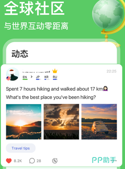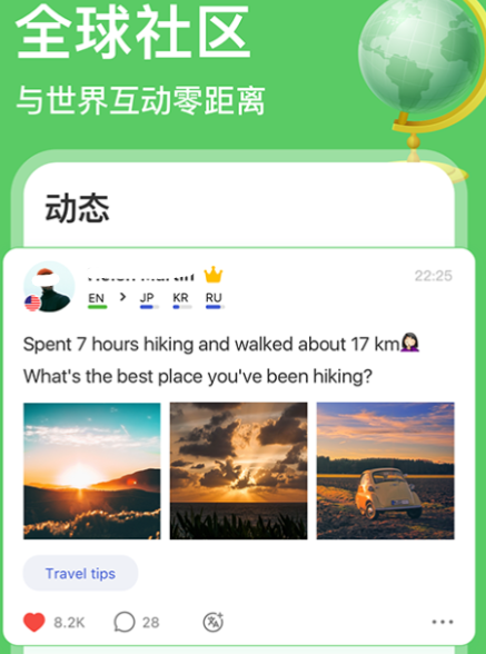 HelloTalk为用户提供了一个全球社区,让用户可以看到大量外国人分享的日常动态,并且可以通过评论区进行交流,或者通过私信来聊天。通过HelloTalk,用户可以与来自世界各地的人成为好友,并享受免费的语音和视频通话功能。这样,用户可以跨越地域的限制,与不同地区的人进行在线沟通,加深语言学习和跨文化交流。该应用还提供了区域筛选功能,方便用户针对不同语种进行语言学习练习。这有助于用户获得更准确的语音和文化交流体验,提高语言水平。