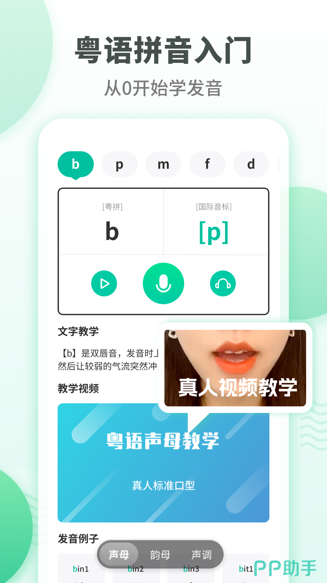 这是一款为粤语学习爱好者打造的一个学习平台。这里有专业的中文与粤语的翻译。当然,这里还有许多地道的广东话录音资源,那大家可以从零基础开始,轻松的入门,学习粤语。这里有真人教学粤语如何发音,例如对于基础粤语拼音教学包括了19个声母。53个韵母和九个声调。