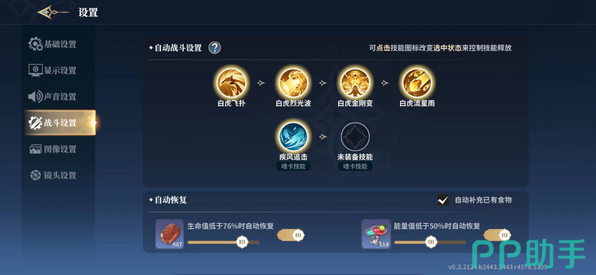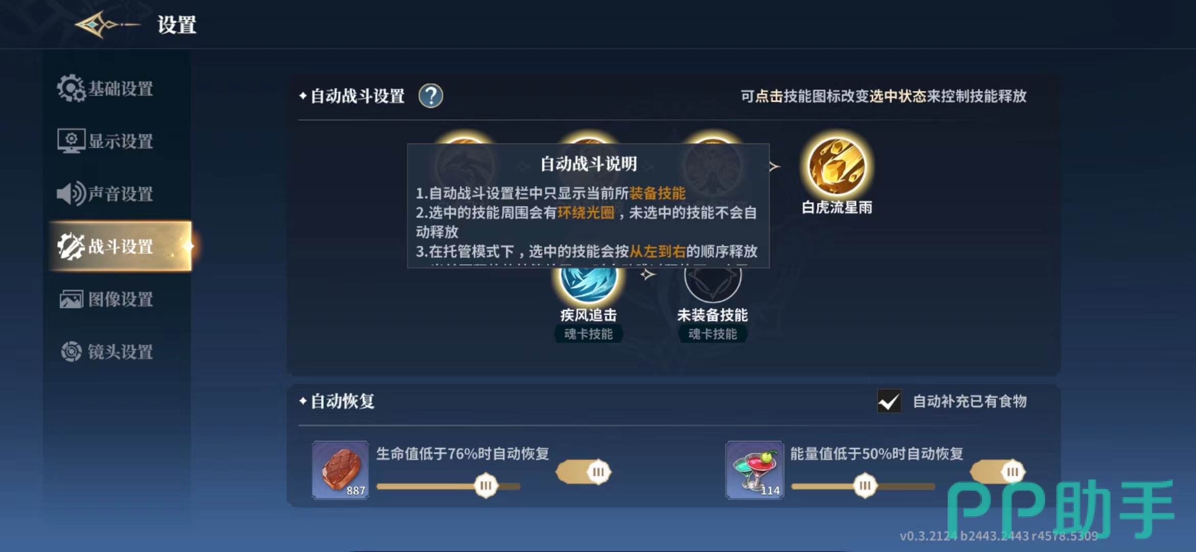 在自动页面设置的时候大家也不要忘记下面还有两个自动恢复,这个设定是保证大家后期血量是否跟得上的关键,如果大家遇到比较强的野怪,在血量低于设置的百分比时,自动恢复会帮助大家消耗上面的食物来恢复血量,一定要记得即时补充上面的药品。