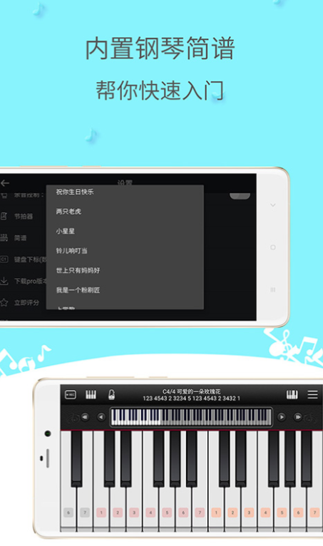 一款可以听钢琴、学钢琴、练钢琴的弹奏软件,在这款应用中大家的手机上会模拟出钢琴的琴键,通过点击屏幕就可以练习弹奏,同时应用中还有不少的钢琴曲谱,能丰富大家的曲库,勤加练习,下一个钢琴大师就是你!