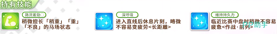 初始持有的三个技能则分别为能改善稍重,重和不良状态下赛跑表现的“路况差劲”,进入直线后不易变疲劳的“深呼吸”,以及能在比赛中段不那么容易疲惫的“维持持久力”,这些都让琵琶晨光的容错率和续航能力得到增强。