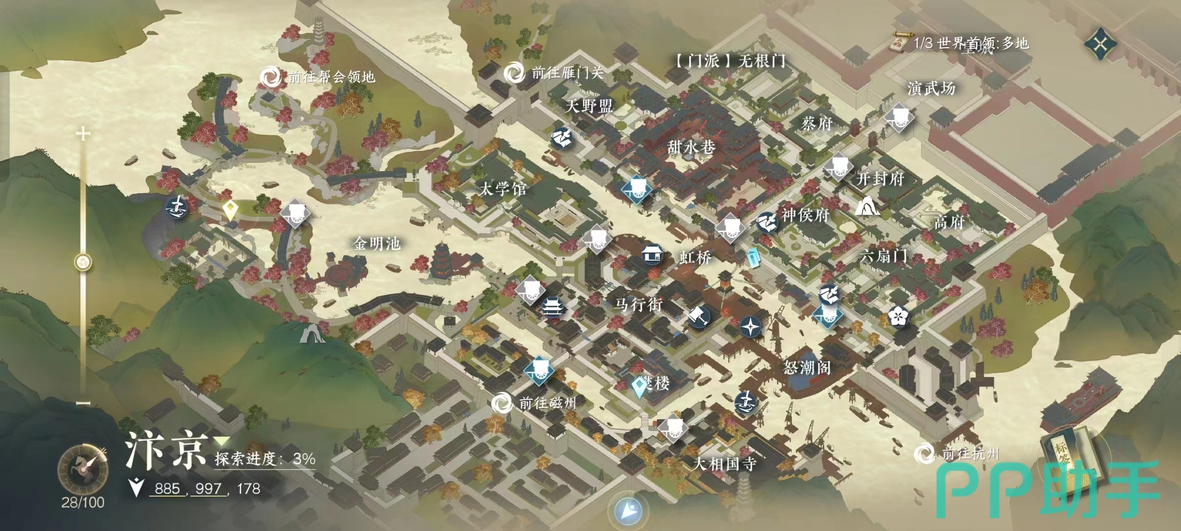 功力排行榜的具体位置在汴京地区的“大相国寺”,在地图最下方的位置,选择传送的方式即可到达,进入“大相国寺”之后要找到一位NPC【魏闻道】,在门口左边的位置,坐标是(764,1245)。