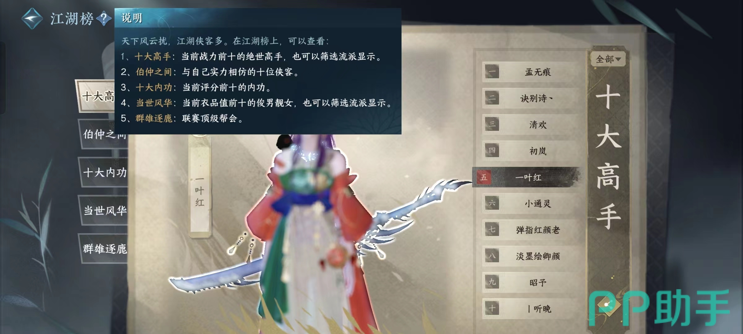 玩家要和魏闻道对话,选择【看看江湖榜】,即可进入江湖榜,不过只显示了玩家的名字,无法直接得到高手的功力值有多少。这前十位高手想要了解哪一位就点击哪一位的名字,可直接显示出来对方的数据,无论是内功还是佩戴的装备都可以查看,小伙伴们可以借鉴他佩戴的装备。