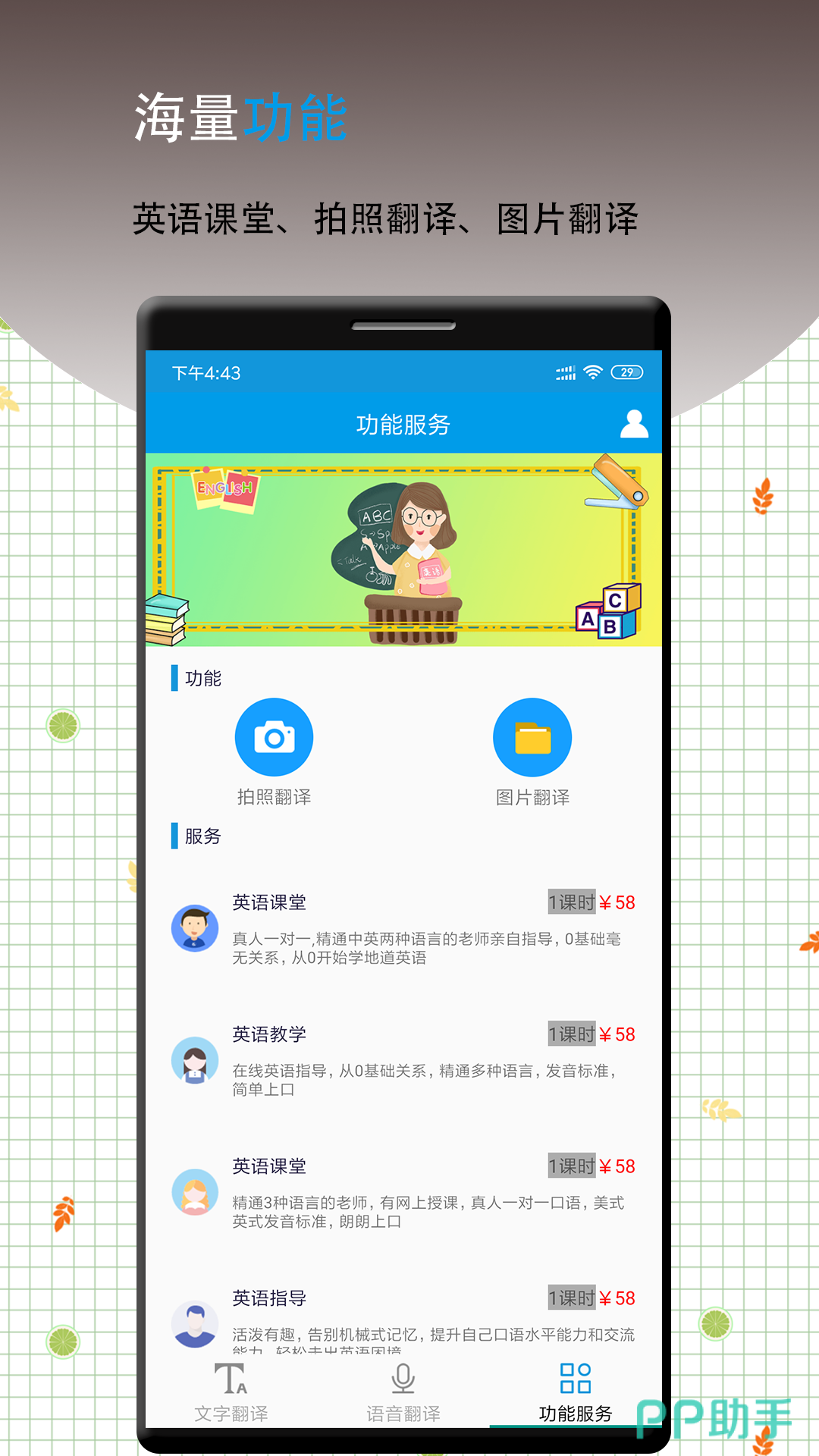 这里是一款手机端的能够实现多种语言相互翻译的软件。能满足用户在学习,工作以及出国旅游时候的翻译需求。采用强大的算法,能够给用户提供拍照扫描翻译,在和国外人交流的时候,他也支持语音翻译,并且可以将翻译结果朗读出来,极大的提高了和国外人交流的效率。