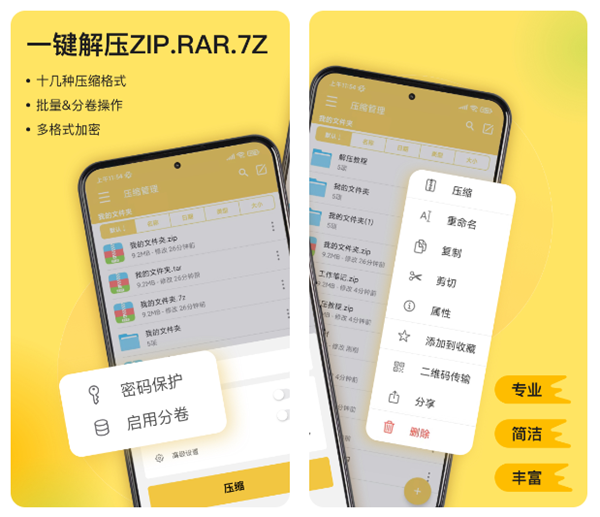一款功能强大的压缩包生成和管理工具,支持的格式非常齐全,在众多的工具中比较少见。不仅可以批量对大量的文件文档进行打包压缩、节省手机的空间,更是带有极速的解压缩功能,通过先进的处理核心能够显著提升文件解压和预览的速度,而且还带有多种模式可以选择,满足不同的文件类型或使用场景。