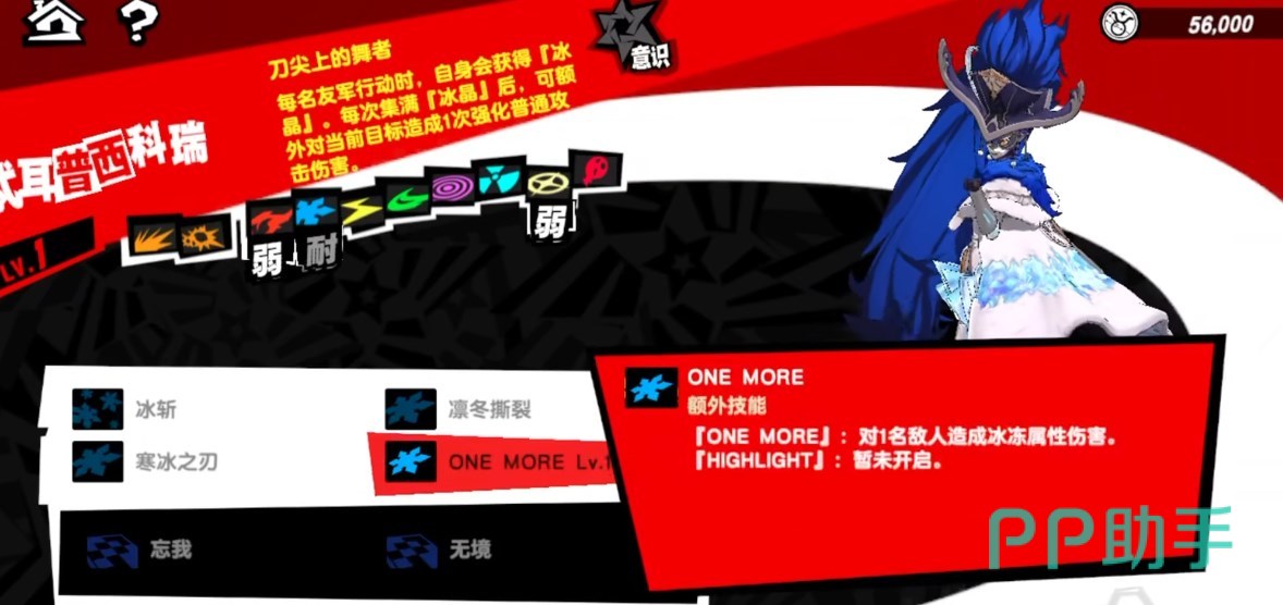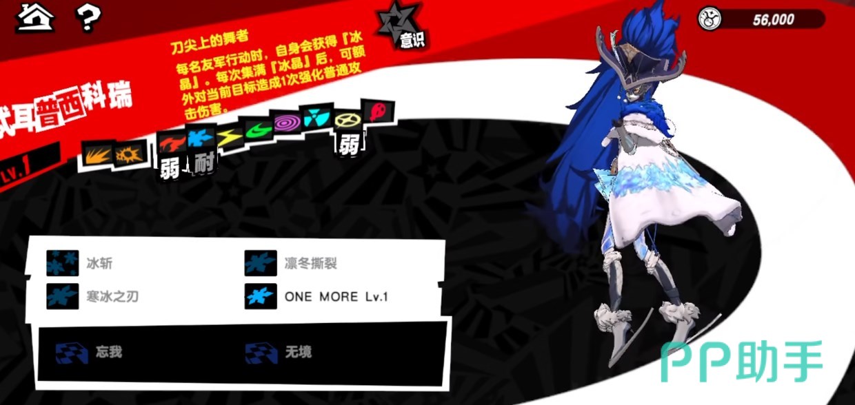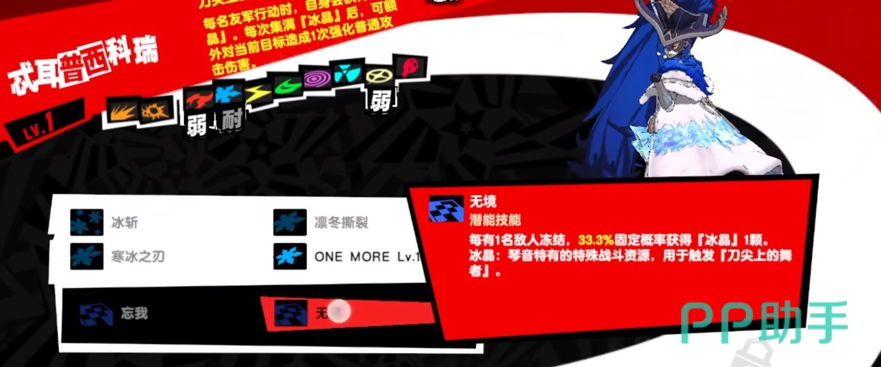 初始攻击104,初始生命316,中规中矩,不是特别亮眼。她的人格面具“忒耳普西科瑞”,弱火耐冰,被动是在队友行动的时候,自身得到一层冰晶,集满冰晶的话可以额外对当前目标造成1次强化普攻。