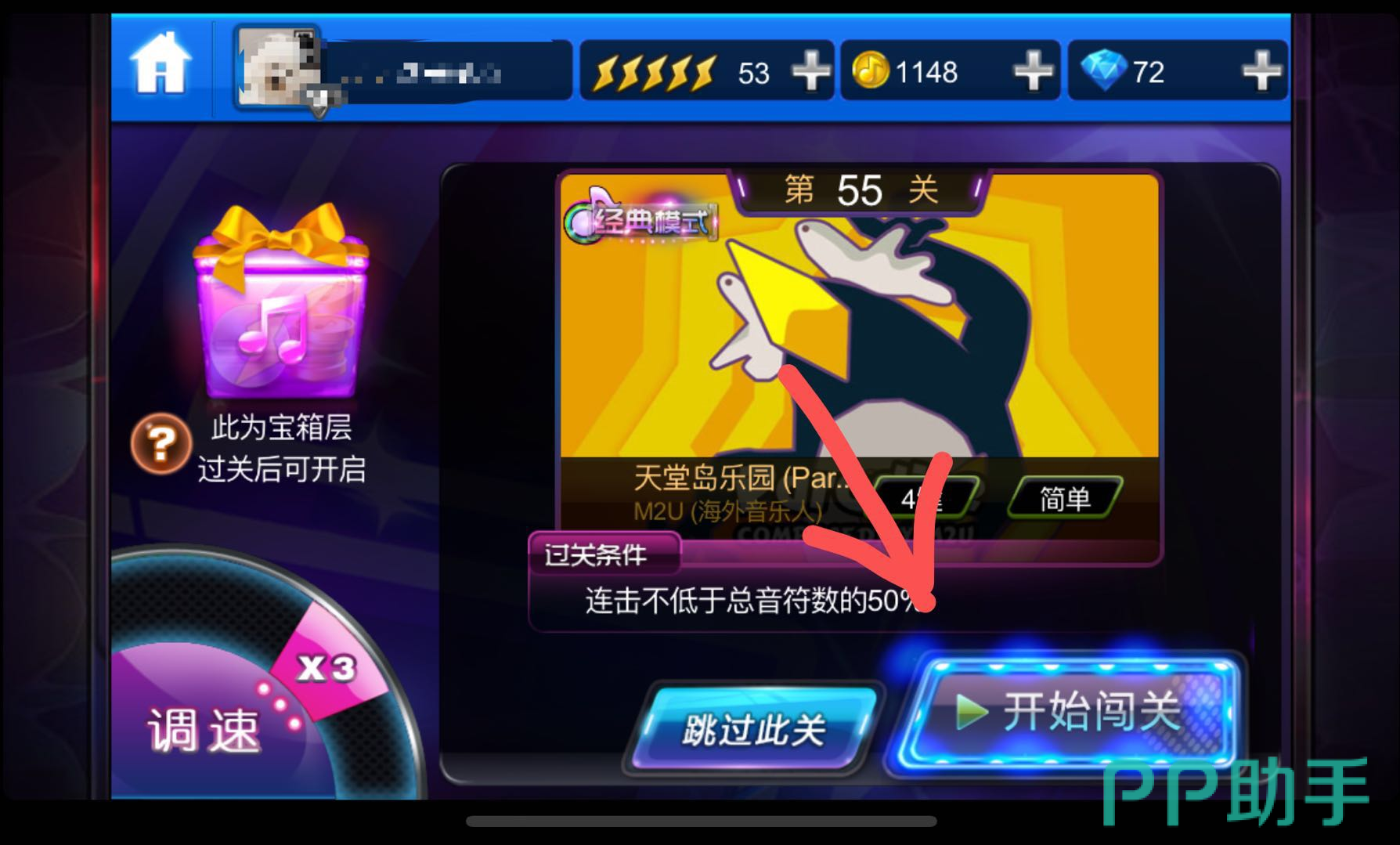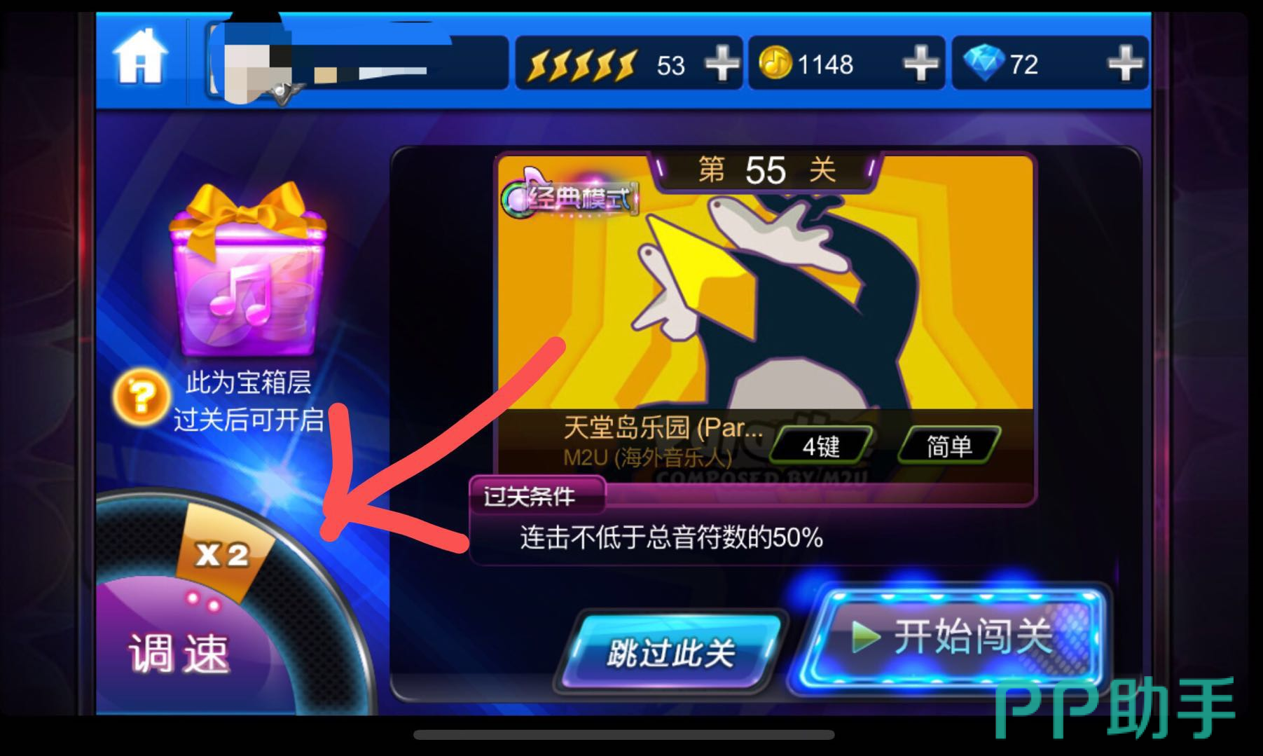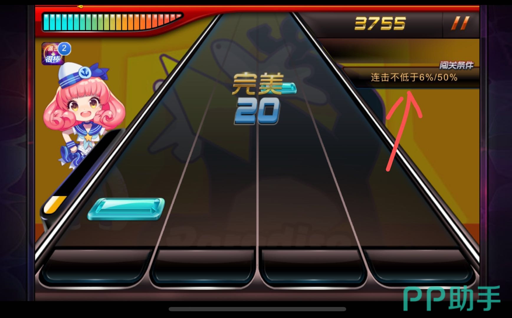 开始游戏之后就会进入节奏大师的游戏界面,在右侧玩家需要注意的是闯关条件。每一关的音乐和闯关条件是不一样的,如果没有达到闯关条件,计算分数再高也无法通关。