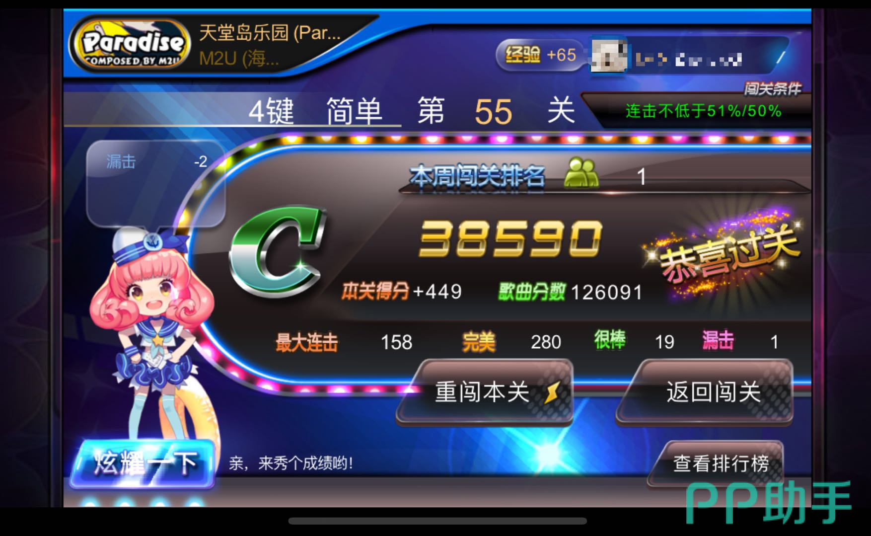 在完成一整首歌曲的节奏敲打之后,会出现结算界面。这个界面会显示玩家的评分,按照等级从高到低分别是S+、S、A、B、C、D、E。就算分数低,但是达到了闯关条件依然可以过关哦~