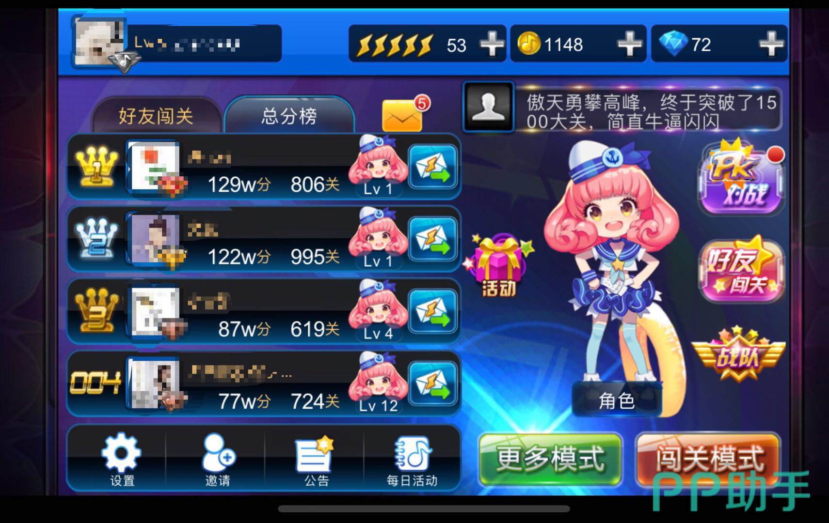 进入游戏大师游戏的主界面,可以看到十分丰富的菜单栏,如果选择和微信好友一起玩,则会读取微信的好友数据,只要同样下载了这款游戏并且用微信登录的好友记录就会出现在排行榜上。这款游戏的主流玩法是闯关玩法,点击右下角的闯关模式。