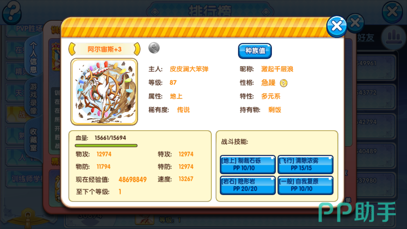 技能解读:经常打竞技场的玩家都知道,攻击力和速度的作用,开亮性格使得阿尔宙斯有着更高的速度,除了极限速度的宝可梦,没有几个速度能够追的上拥有140速度种族值的阿尔宙斯,起手叠加剑舞,可以做到秒杀的效果。