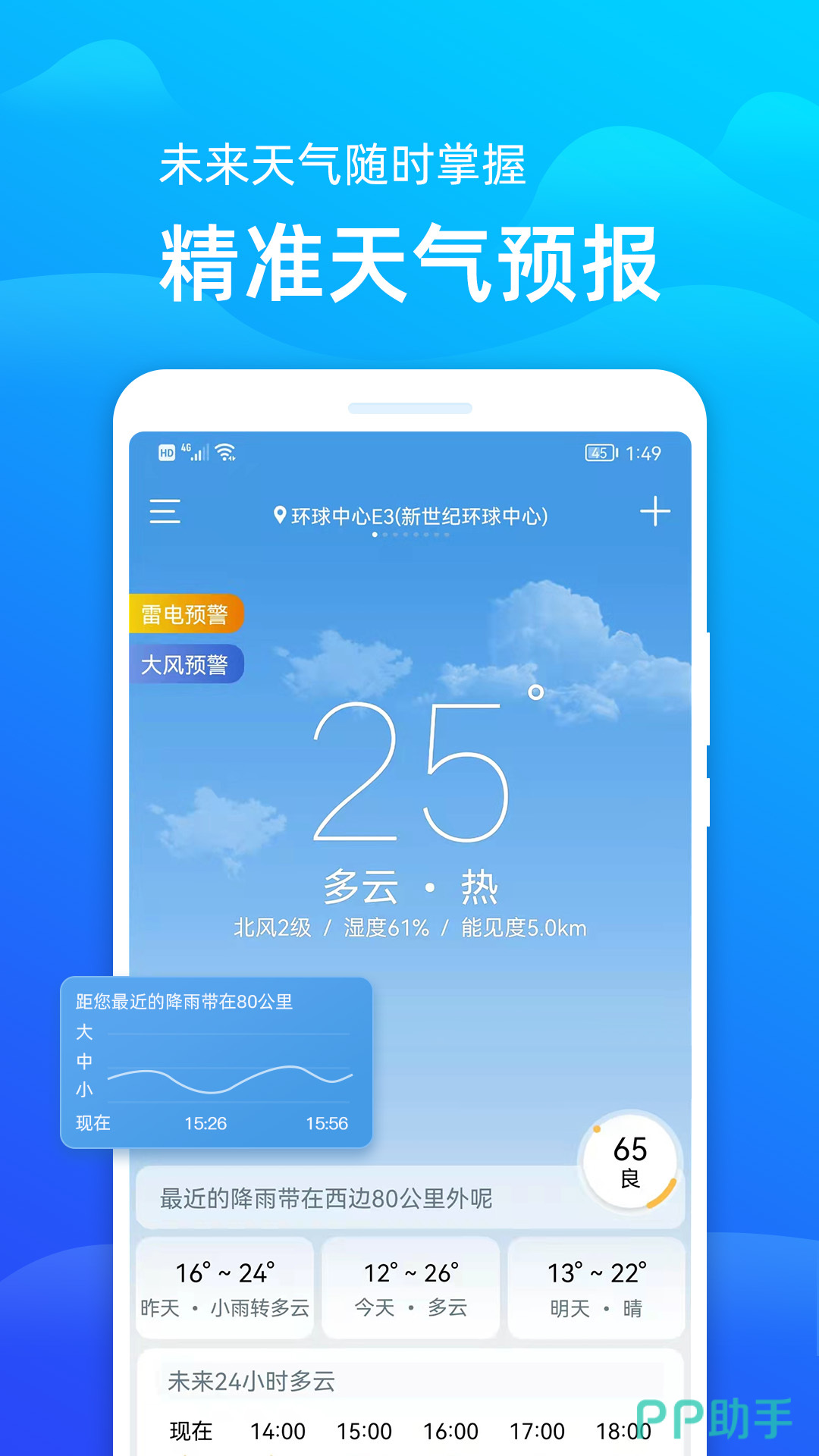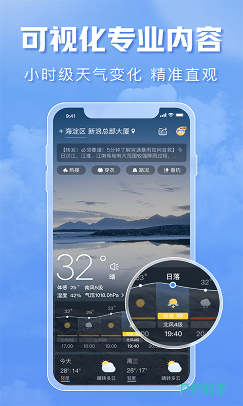 国内非常早的专业软件,在产品质量以及提供服务方面都有很成熟表现,现在已经集成超过国内外3000个不同城市预报和预警,还可以进行逐小时预报以及监控各种空气指数等。