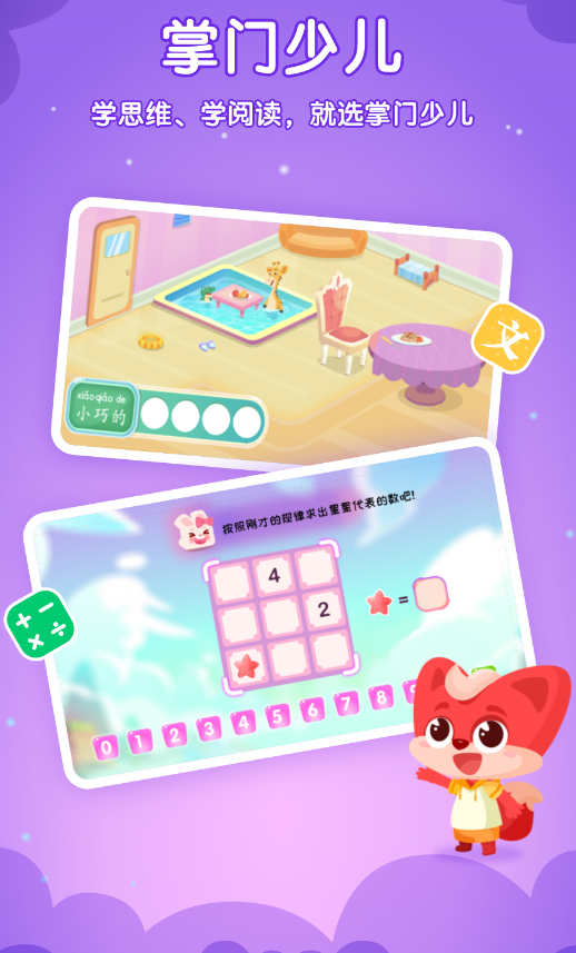 在掌门少儿中,孩子们可以学思维,学习阅读,里面包括了五大知识板块,让孩子们爱上探索与实践,遵循孩子们认知规律,打造科学服务体系,可以沉浸式的体验学习的乐趣,能够培养幼儿的多元思维以及解决与判断能力。