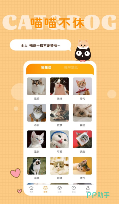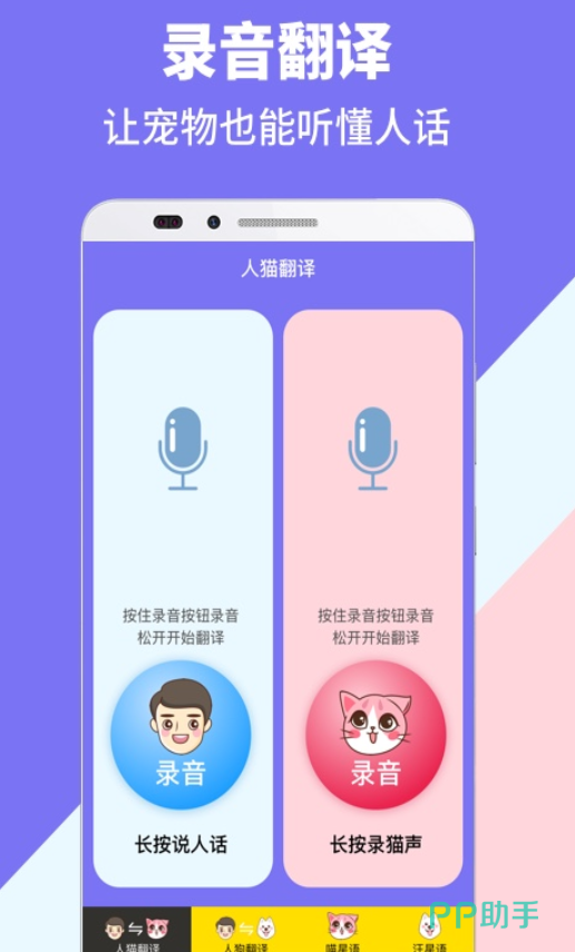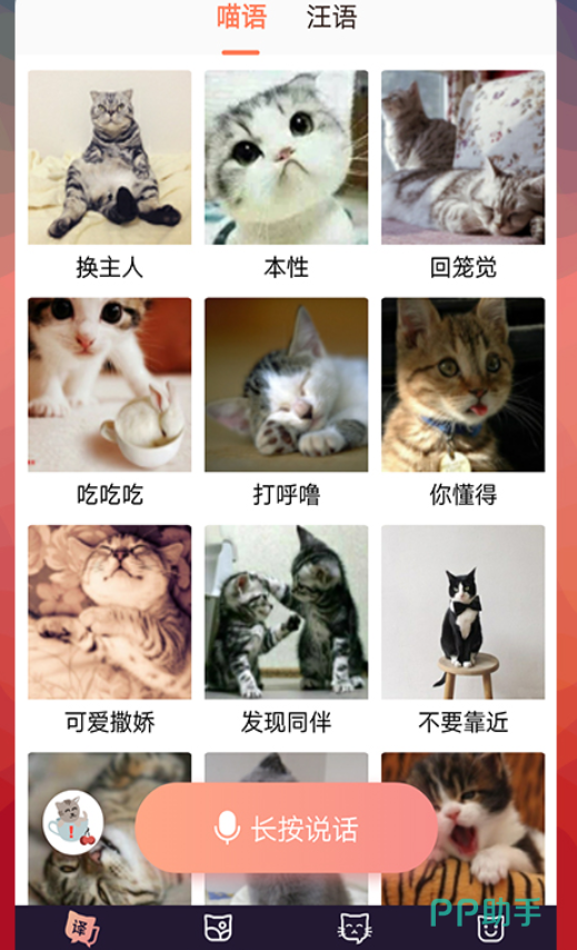 喵喵不休,汪言汪语,这是一款集于多种动物语言为一体的app,可以使主人与爱宠更加亲密对方,利用语言来表达心里的想法,能够让彼此轻松交流,拥有了猫语狗语转换器,可以实时进行互动。