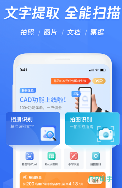 通过该软件可识别多种文字,无论是文字输入、还是拍照,轻轻松松就能够识别成功。对于识别好的内容也可进行编辑、复制、导出等等,支持多种语言的全文互译。还可对照片证件进行扫描,支持多种格式之间的转换,为了满足大众用户的需求,该软件也在不断的更新,新增了AR测高度功能、以及优化首页等等。