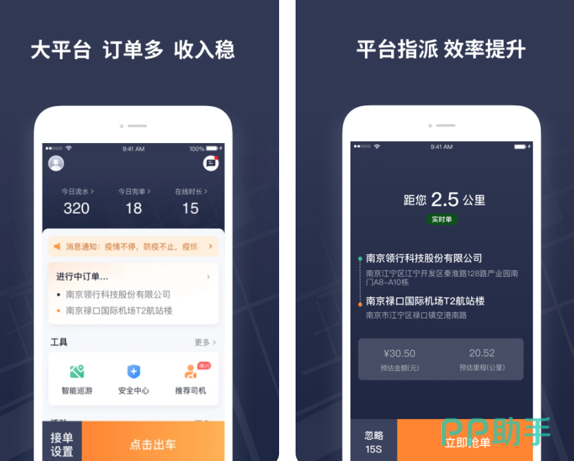 软件有AI智能助手帮忙显示抢单、接单与平台派单,用户客源偏向于商务人士与白领,相对来说客单价比较高,针对开车来不及操作手机屏幕的情况,软件有各种快捷操作与自动服务,贴心体验便捷护眼。