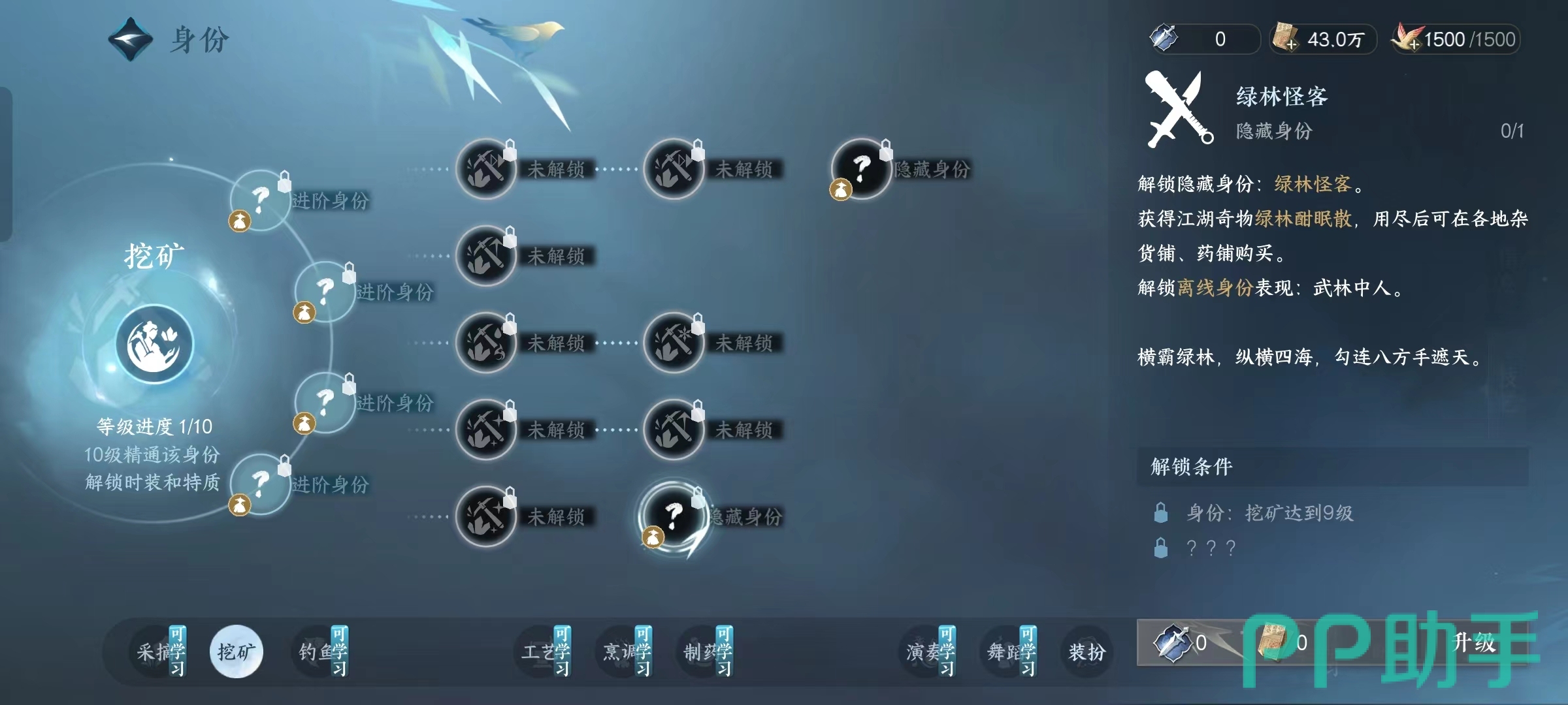 绿林酣眠散获取的途径是单一的,只有玩家解锁游戏中的隐藏身份“绿林怪客”,才能获取绿林酣眠散。首先玩家要打开菜单,点击【身份】,在身份页面的最下面解锁挖矿,然后点击最右边的【技艺】,在第二列的最下面有一个类似于双刀交叉的图标,这个图标对应的就是“绿林怪客”身份。