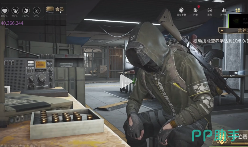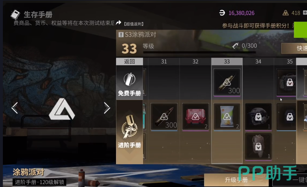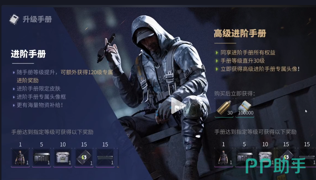 其次我们可以点击屏幕右上角一系列的选项的第一个:生存手册。我们点击升级手册,升级生存手册可以让我们在获取游戏经验的同时解锁比免费手册更好的装备和装备特效。