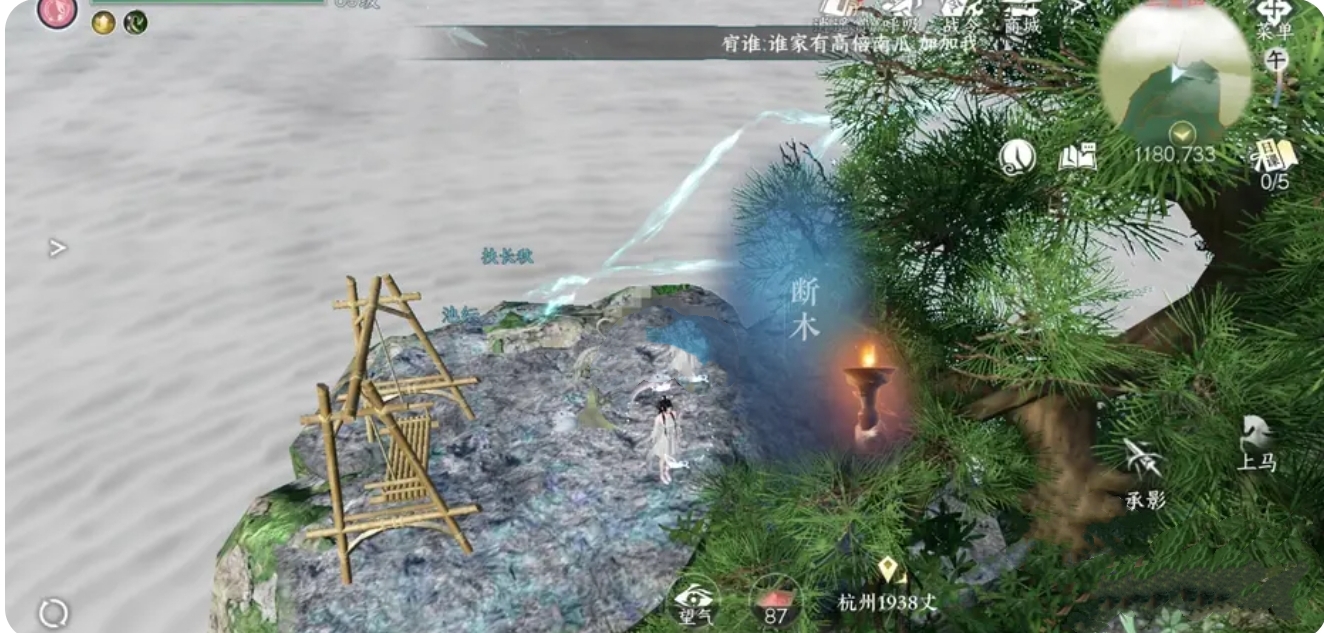 接下来要做的就是来到旁边一座山的山顶,这里的坐标是在(1181.731),来到这里之后也会看到有仙鹤雕像,再一次点击这种雕像,系统就会出现一个断木两个字的提示,而这时玩家们就运用关于火系的法术将宝箱点燃,就可以成功打开宝箱了。