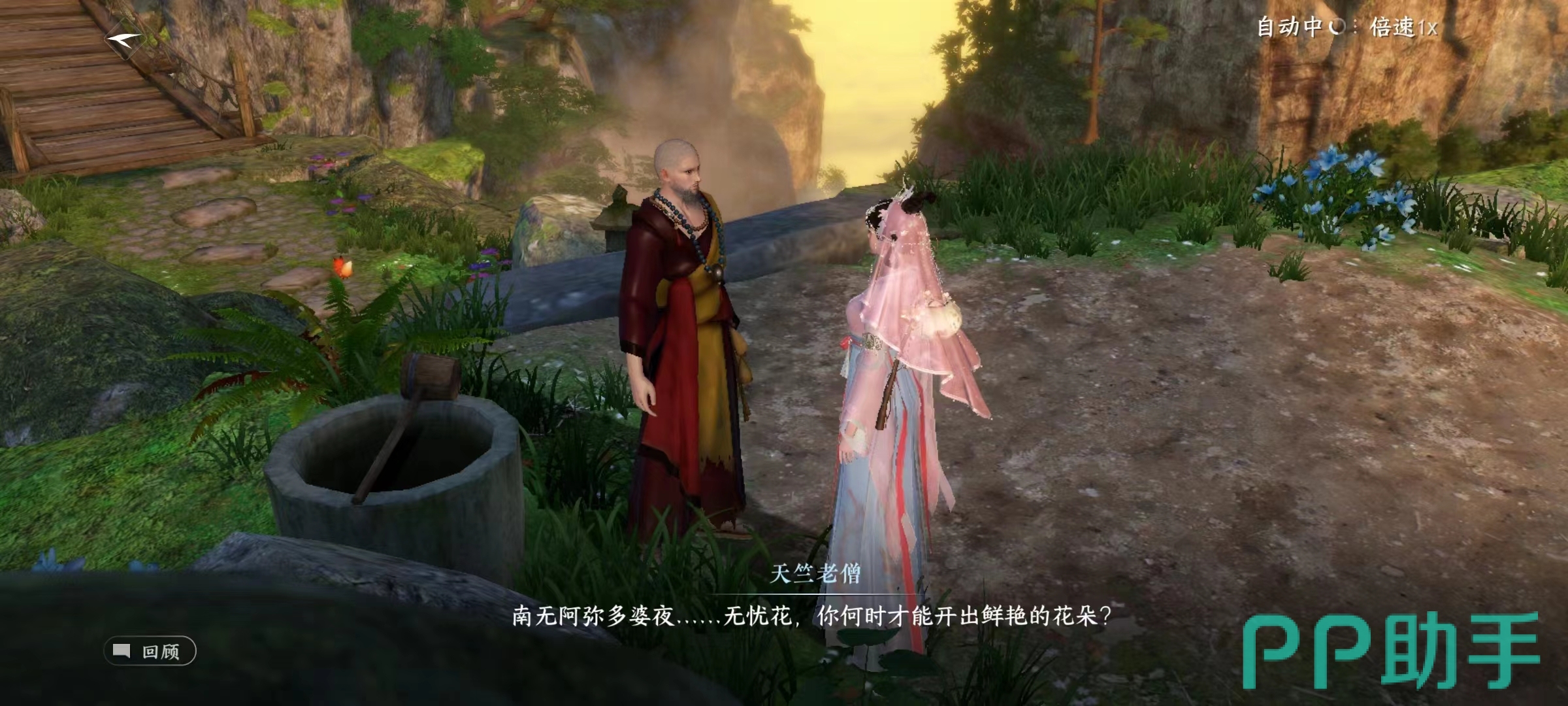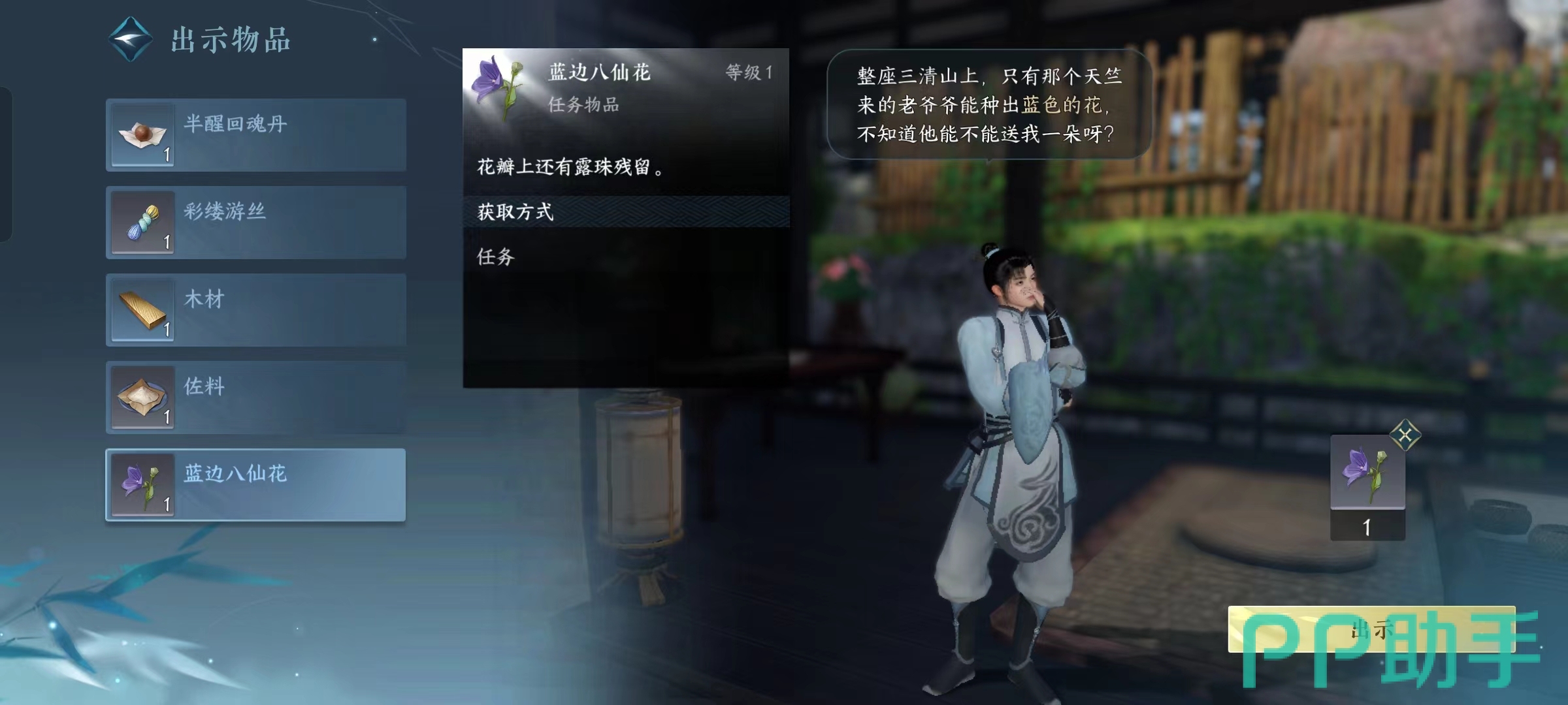 在谈话的内容中知道他想要一朵蓝色的花,而小编在上面输出了获取蓝色花朵的途径,直接出示给他就可以了,这时传闻更新,下一步就是帮助“之柏”插花。