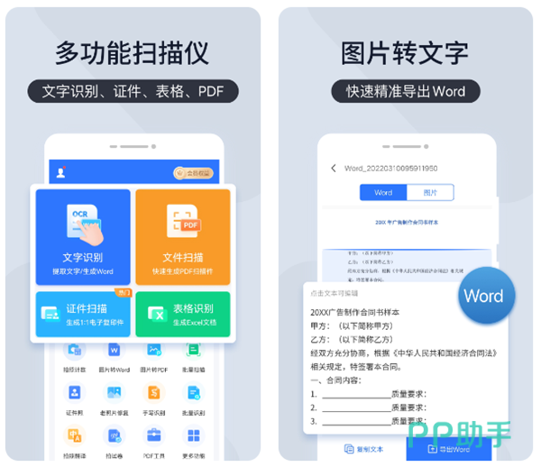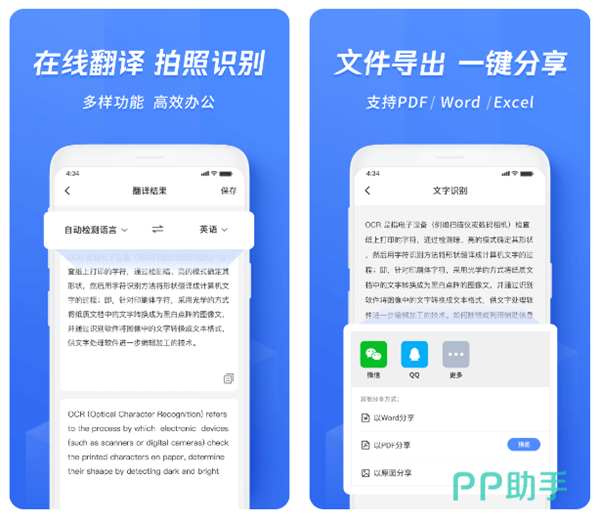 一款老牌的文字提取工具,不仅是可以通过导入图片,甚至还支持直接使用手机摄像头来完成扫描或者是拍照来进行识别。在识别修改之后可以自由选择转化为txt、doc或者是pdf等众多格式,还可以一键分享到其他软件中发送给小伙伴们。