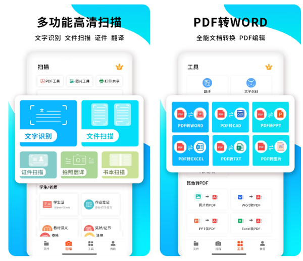 同样是带有多种功能的文档扫描工具,除了强大的文档格式转化和文字提取功能之外,使用这款软件还可以快速识别出银行卡、证件、名片等,从而将信息加入对应的APP平台中。通过手机摄像头调用,软件可以拍摄并且转化出高清版的电子版文档,不仅是可以转化保存为PDF格式,还可以选择文字是否可复制、加密保护等不同的参数设置。