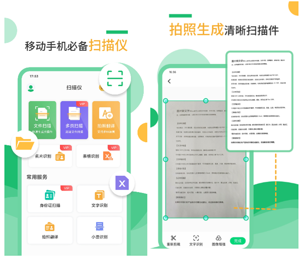 一款颇为专业的手机扫描工具,在对着纸质版文档进行拍摄之后不仅是能够进行文字的自动识别,还可以自动生成为清晰版本的扫描件样式,更是可以添加多种滤镜、水印,满足不同的需求。在生成的阶段我们还可以选择将文字提取识别出来,这样方便后续的修改,或者是转化为可以复制文字的PDF格式以满足工作上的一些特殊需求。