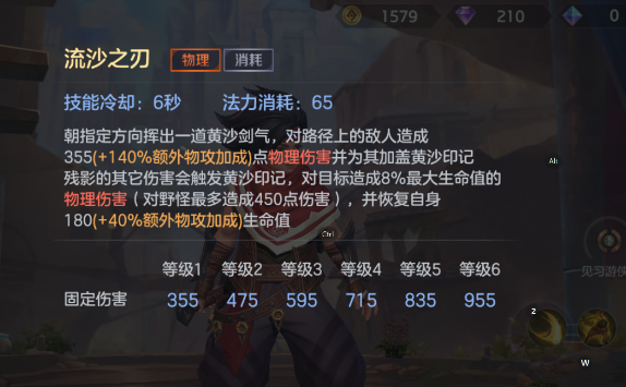 流沙之刃:可以对前方敌人释放一个剑气,被击中的敌人都会被附上一层印记,这个技能可以和被动技能很好的联动在一起,触发印记效果后自身还会回复生命值!