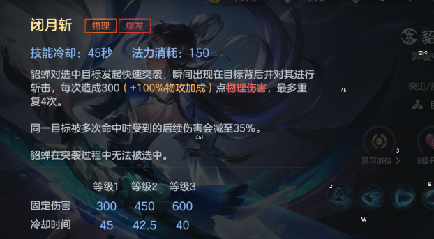 闭月斩:高爆发伤害技能,对选中的敌人进行多段伤害,同时可以快速瞬移到目标身边,但是四次伤害会被慢慢削减,在攻击的同时也是没有办法兑貂蝉进行选择的!