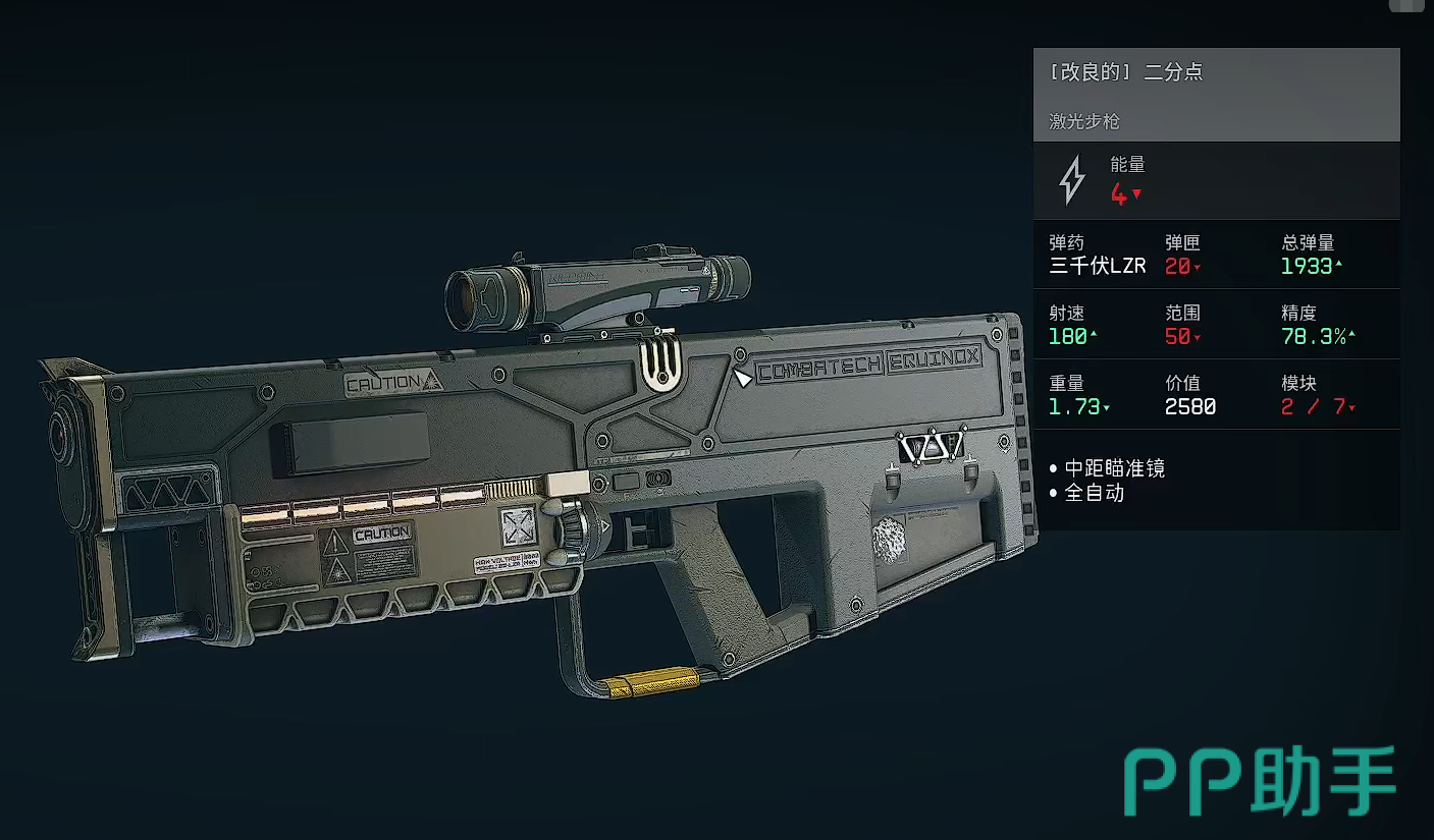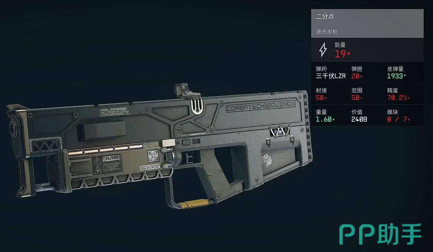 二分点:这是把能量型武器,单发伤害虽然只有19,但凭借1933的超高子弹数量以及50的高额射速,每秒的伤害仍然会十分可观,它的范围虽然与其他步枪相比没有太大优势,但70.2%的精度却比多数步枪都要强一些,而且1.6的重量也让它的持有者具备更高的速度,在战场上也能更加灵活的应对各种突发情况。