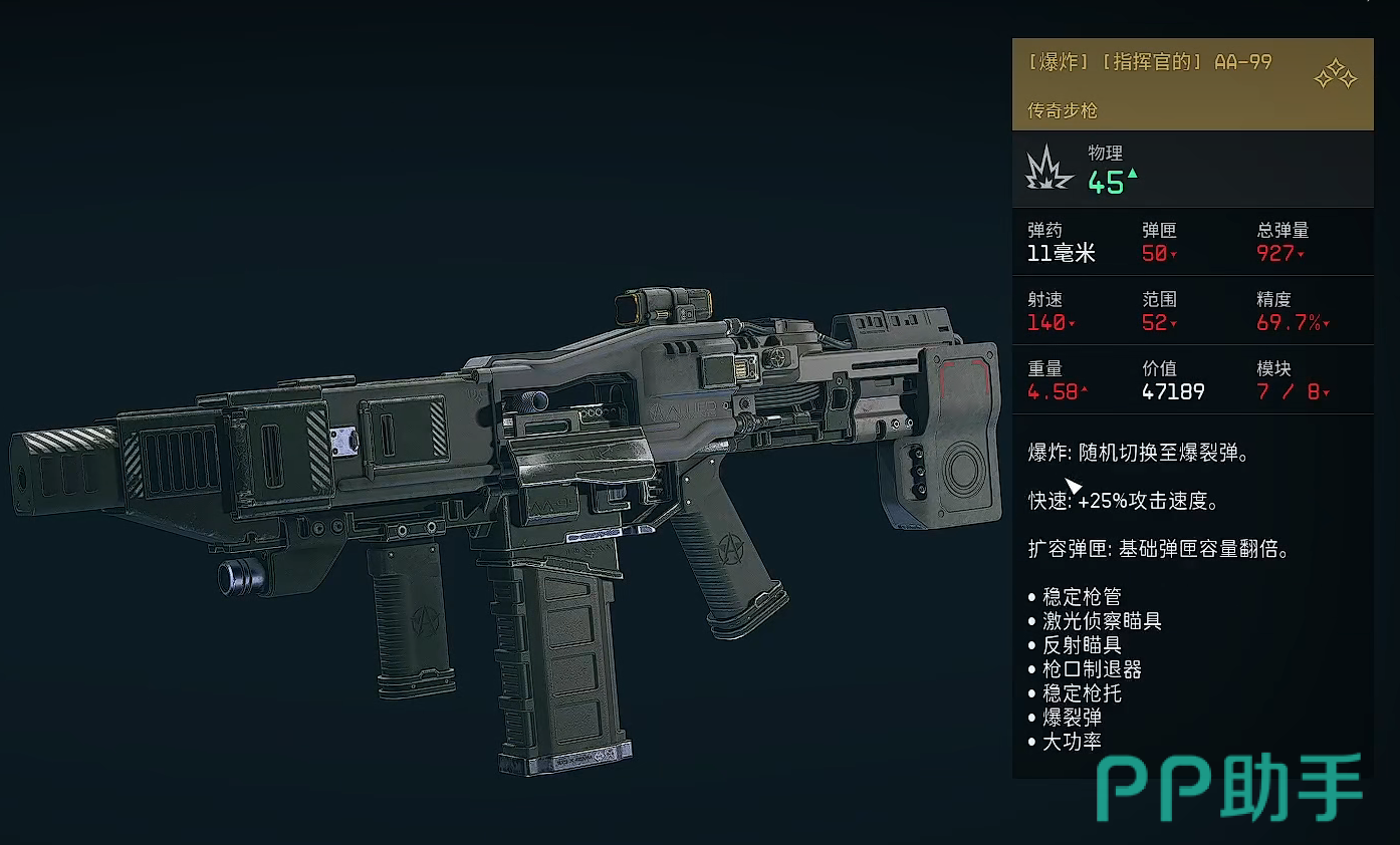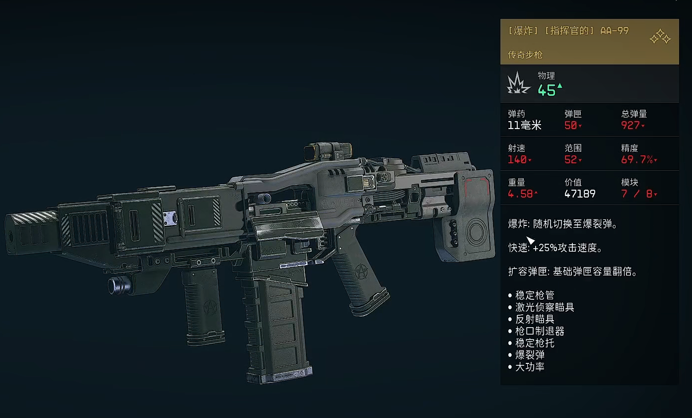 [爆炸][指挥官的]AA-99:该枪械的各项属性都十分夸张,首先弹匣容量就达到了惊人的五十,这对于一把威力足有45的步枪来说是非常可观的,而且它的总弹量也有着927,在探索星球的时候完全不会出现不够用的情况,另外其140的射速和52的范围也算得上出类拔萃,不过与这些相比的话,69.7%的精度却是略显不足,最后就是4.58的重量偏大了一些,拿着它战斗可能机动性会变差。